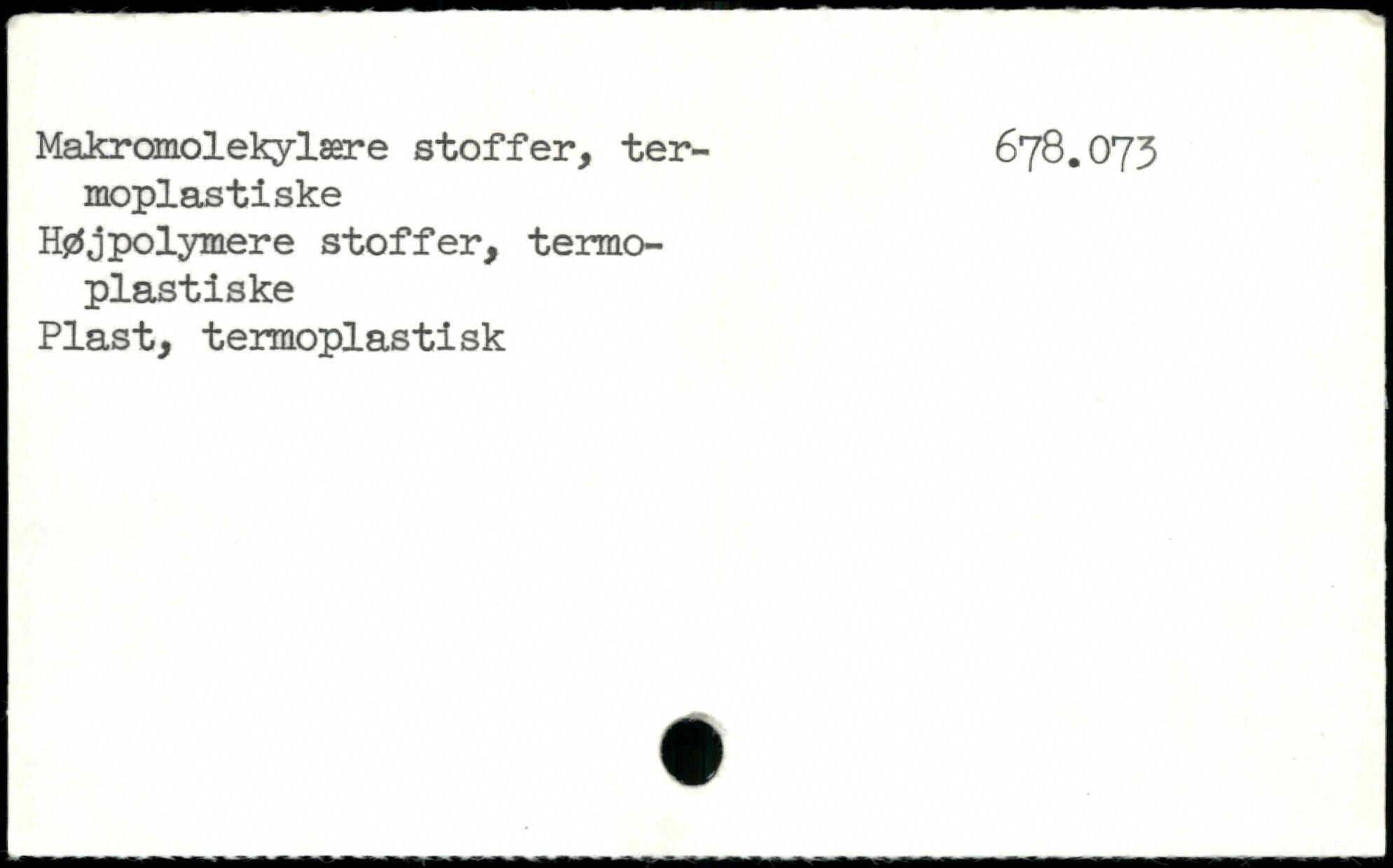Makromolekylære stoffer, ter- 678.073 moplastiske Højpolymere stoffer, termo-plastiske Plast, termoplastisk