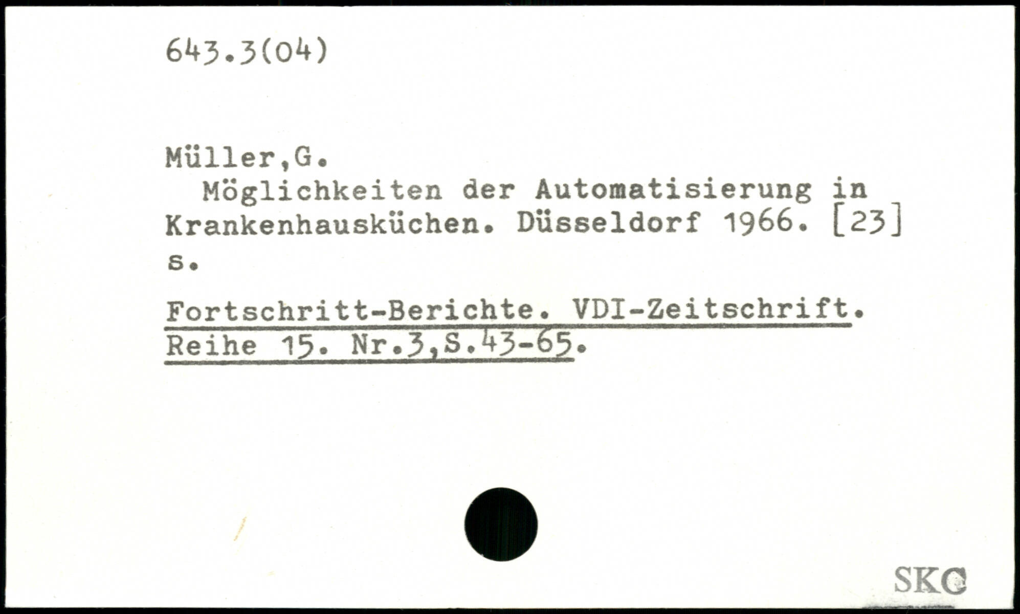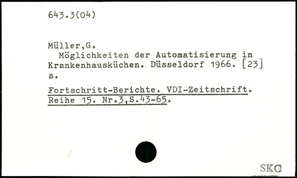 Möglichkeiten der Automatisierung in Krankenhausküchen. Düsseldorf 1966. [23] s. Fortschritt-Berichte. VDI-Zeitschrift. Reihe 13, Nr.3.S.43-63, _SK Q