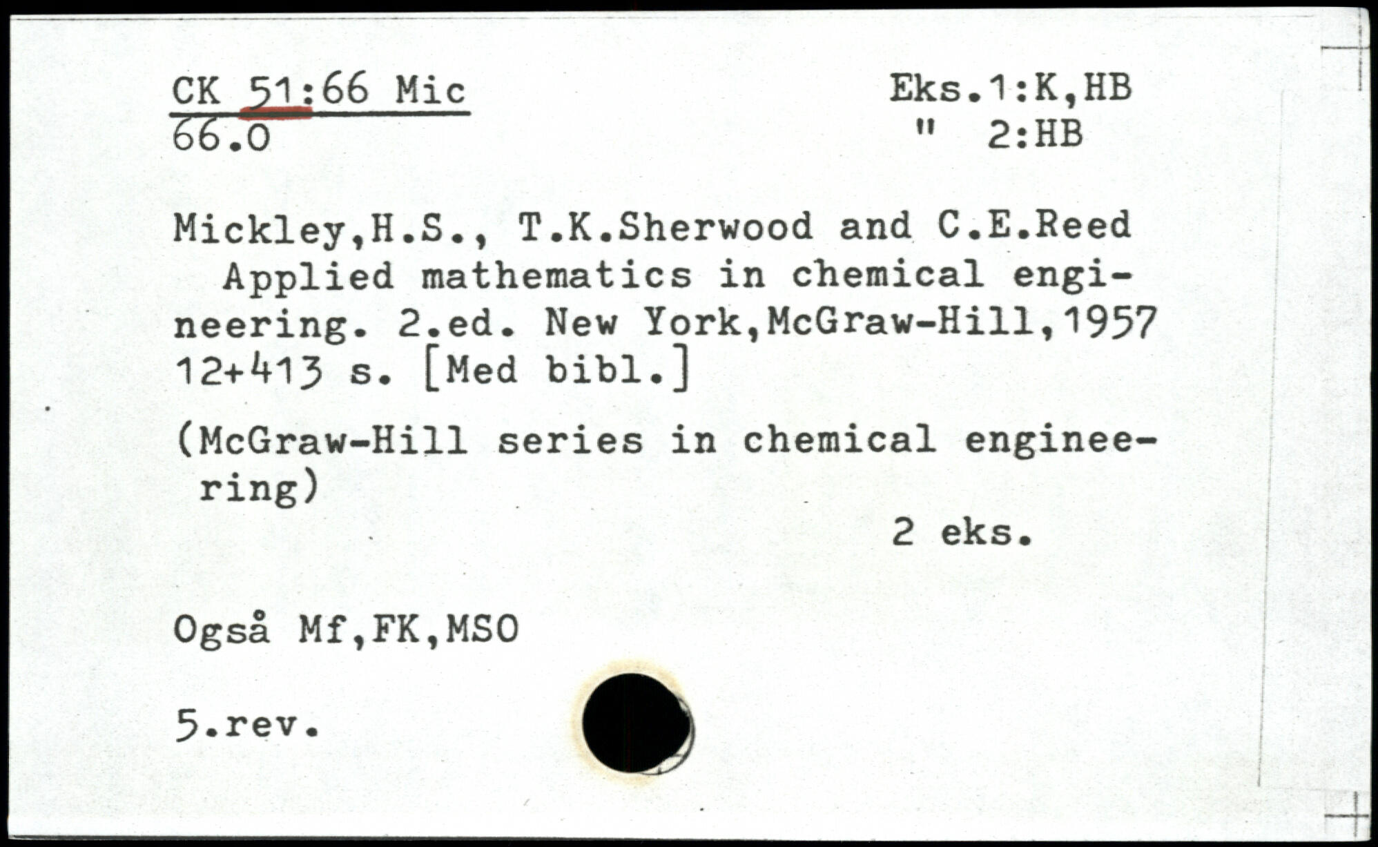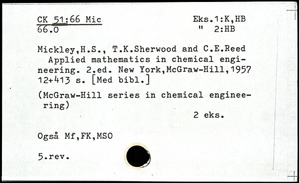 Mickley,H.S., T.K.Sherwood and C.E.Heed Applied mathematics in chemical engineering.