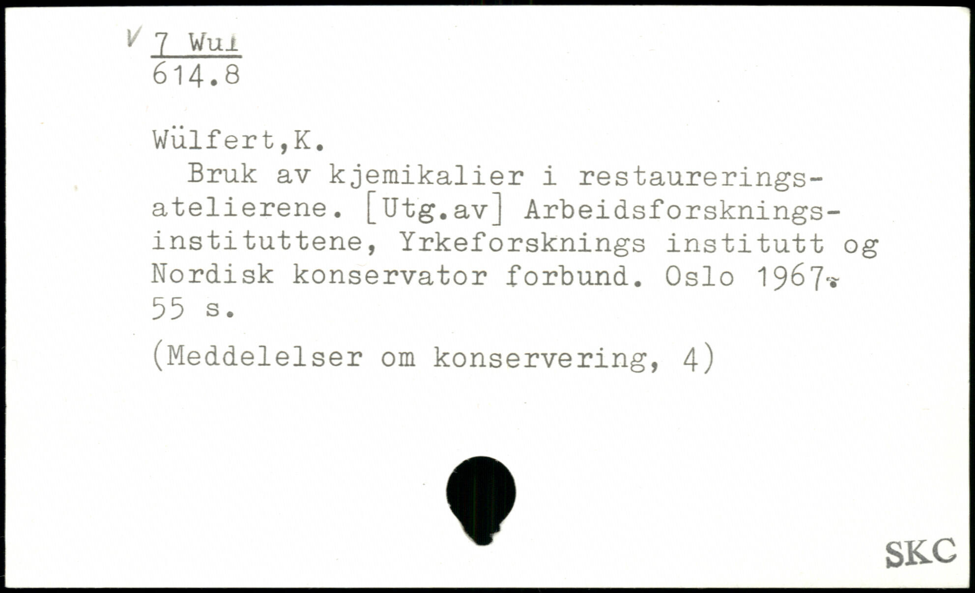 Bruk av kjemikalier i restaureringsatelierene. [Utg.av] Arbeidsforsknings-instituttene, Yrkeforsknings institutt og Nordisk konservator forbund. Oslo 1967.
