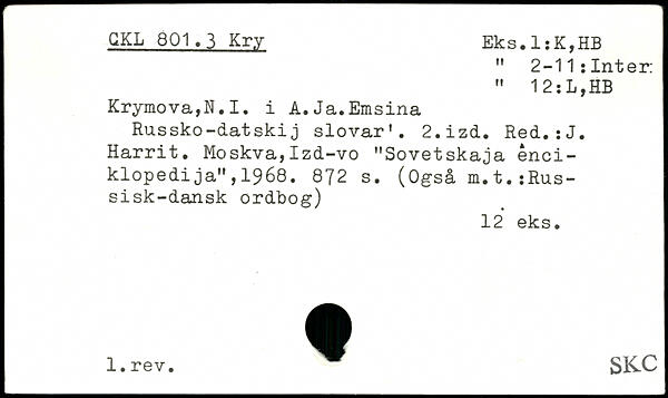 Krymova,N.I. i A.Ja.Emsina Russko-datskij slovar'. 2.izd. Red.:J. j Harrit. Moskva,Izd-vo "Sovetskaja énci-klopedija",1968.