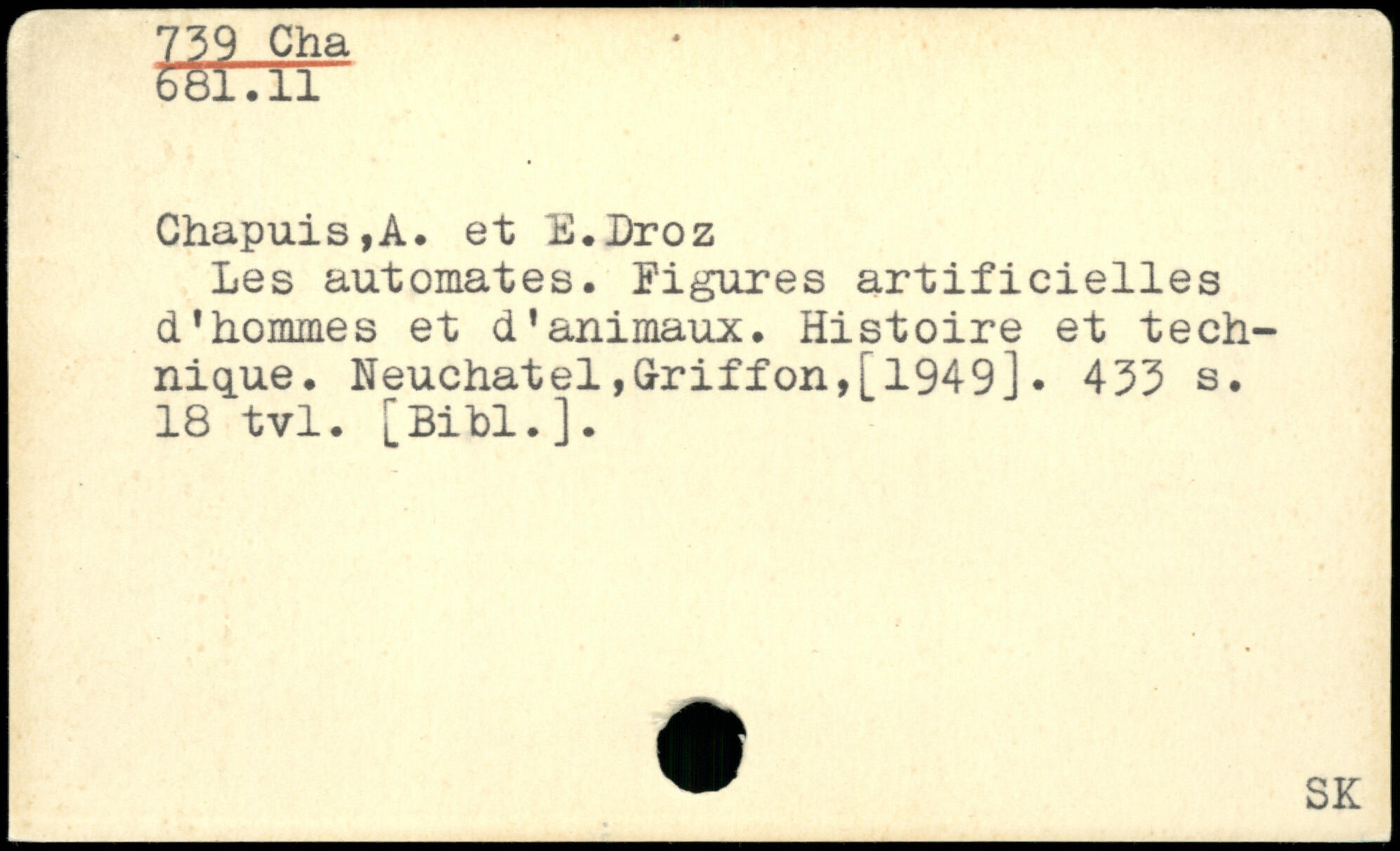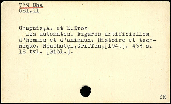 Les automates. Figures artificielles d'hommes et d’animaux. Histoire et technique. Neuchâtel,Griffon,[1949].