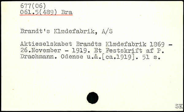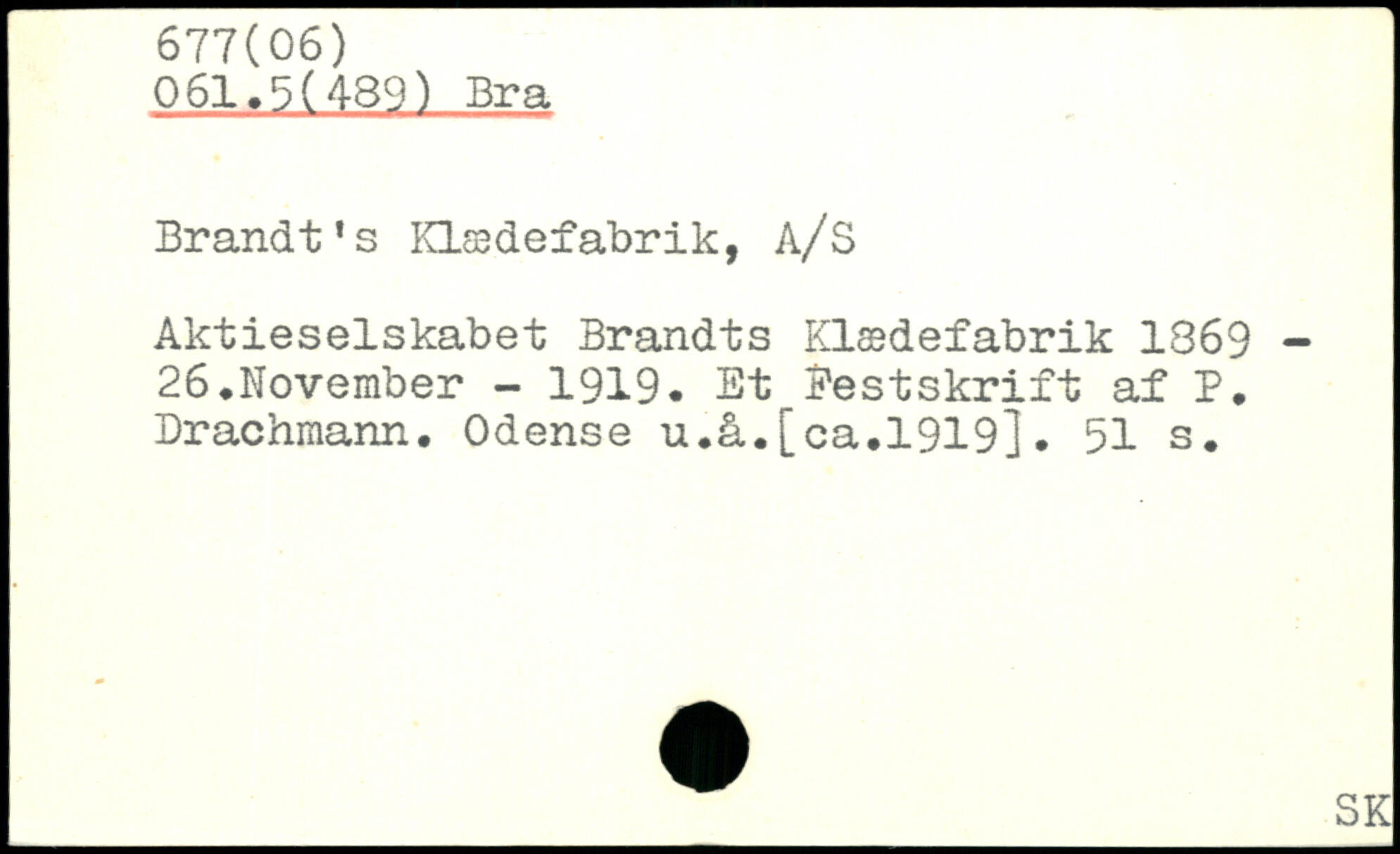 Brandt's Klædefabrik, A/S Aktieselskabet Brandts Klædefabrik 1869 -26.November - 1919. St Festskrift af P. Drachmann. Odense u.å.[ca.1919].