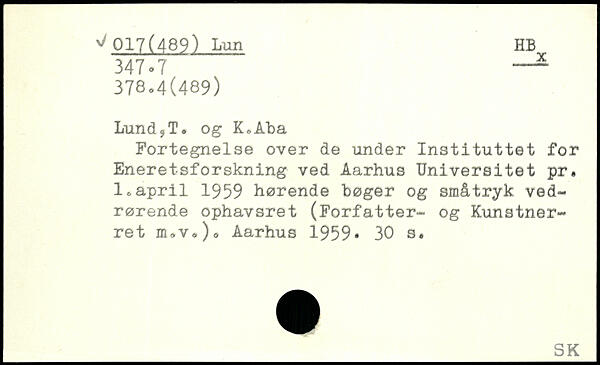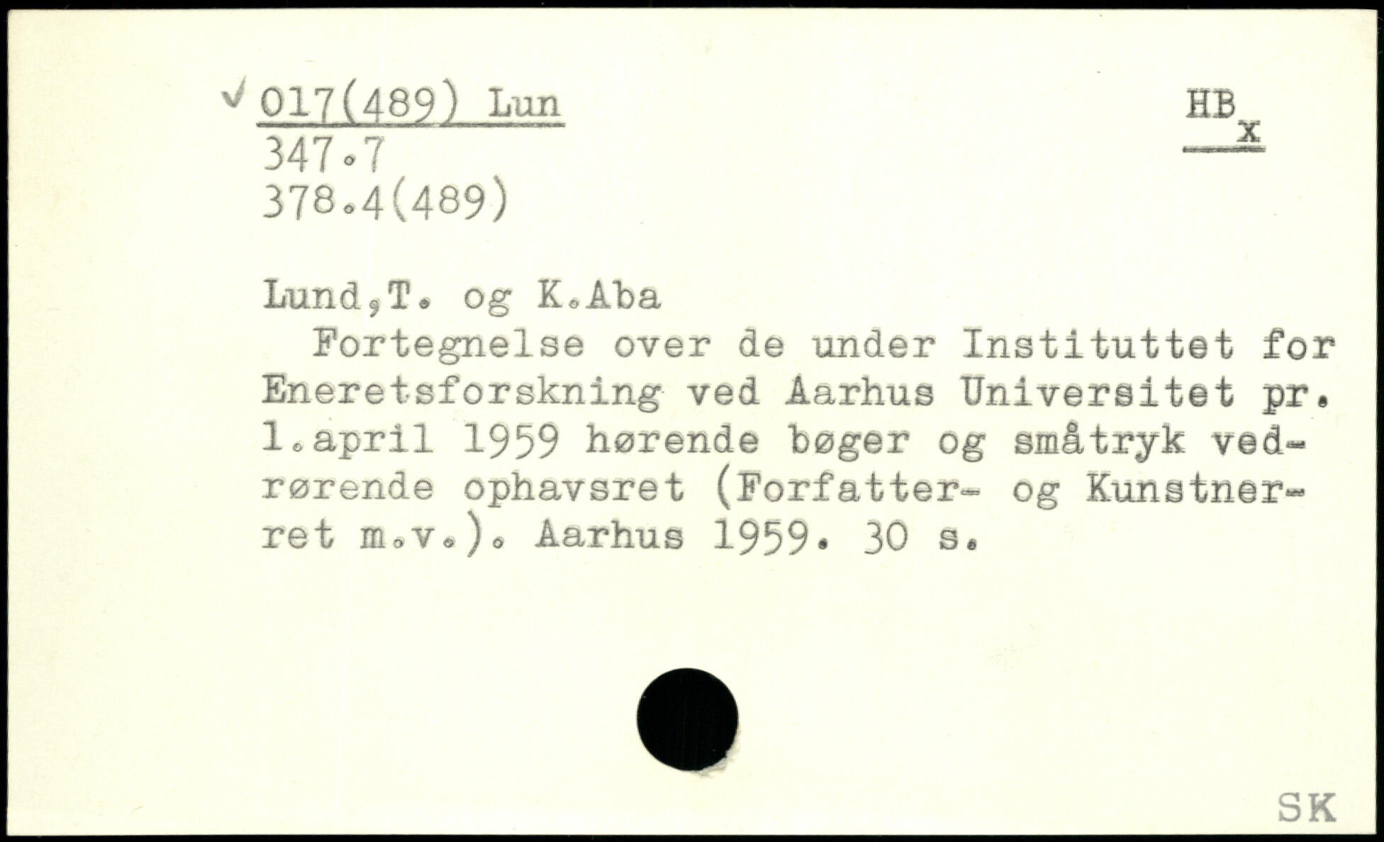 Fortegnelse over de under Instituttet for Eneretsforskning ved Aarhus Universitet pr. I,april 1959 hørende bøger og småtryk vedrørende ophavsret (Forfatter- og Kunstnerret m<,v.)o