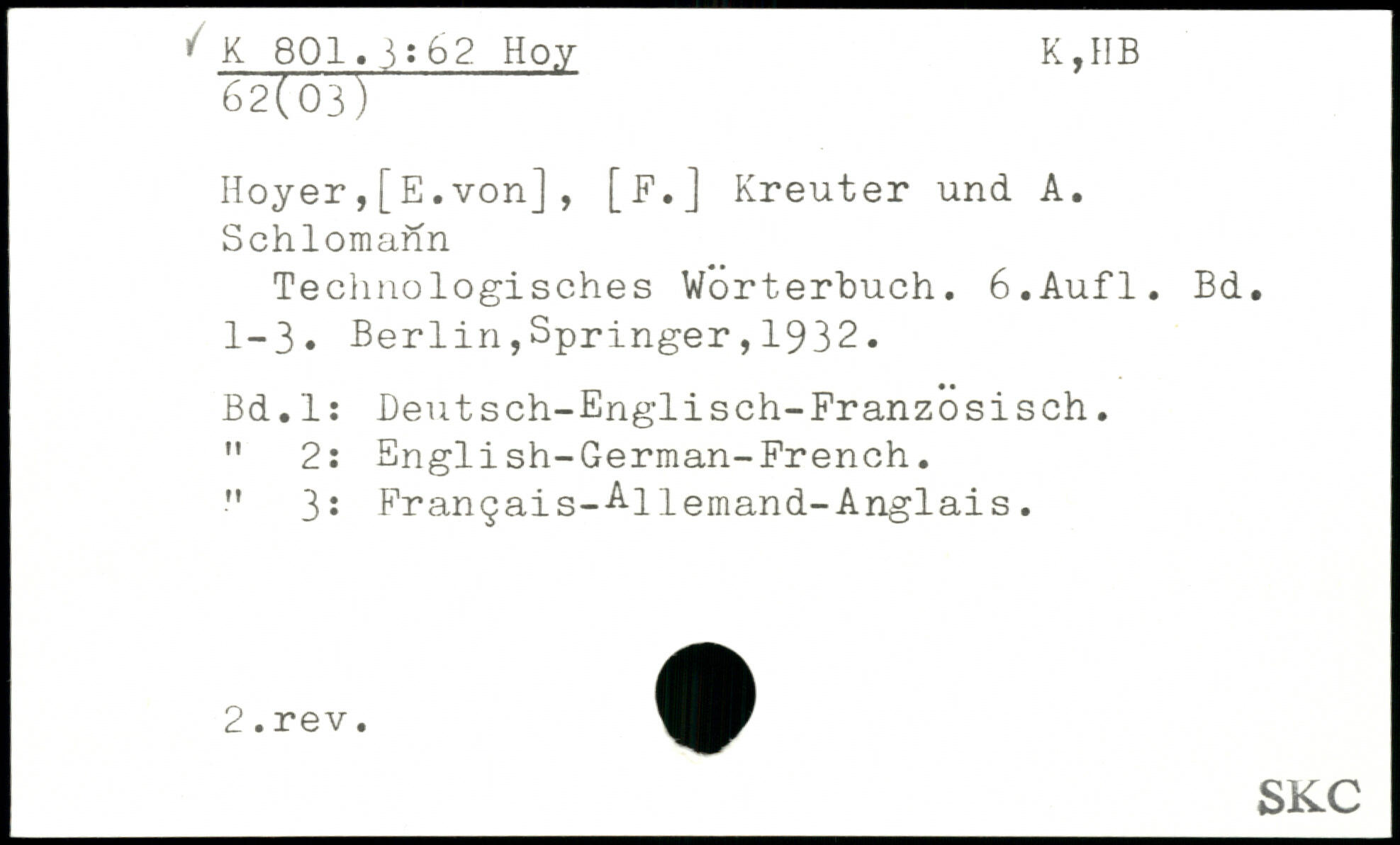 Hoyer,[E.von], [F.] Kreuter und A. Schlomann Technologisches Wörterbuch.