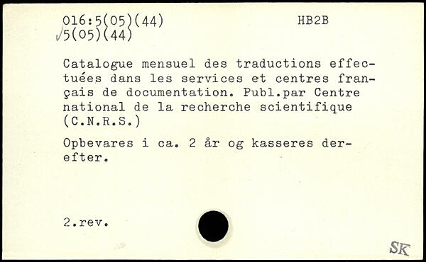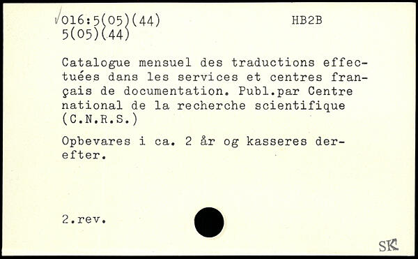Catalogue mensuel des traductions effectuées dans les services et centres français de documentation. Publ.par Centre national de la recherche scientifique (C.N.R.S.) Opbevares i ca. 2 år og kasseres derefter.