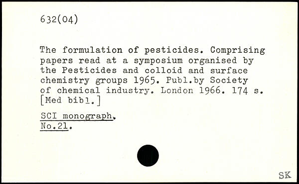 The formulation of pesticides. Comprising papers read at a symposium organised by the Pesticides and colloid and surface chemistry groups 1965