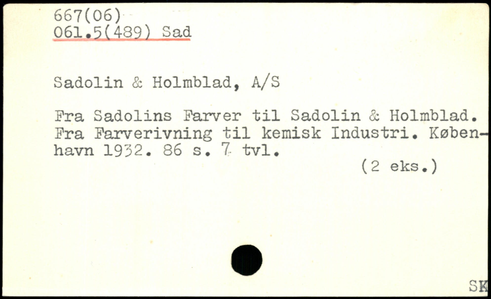 061.5(489) Sad Sadolin & Holmblad, A/S Pra Sadolins Parver til Sadolin & Holmblad. Pra Parverivning til kemisk Industri.