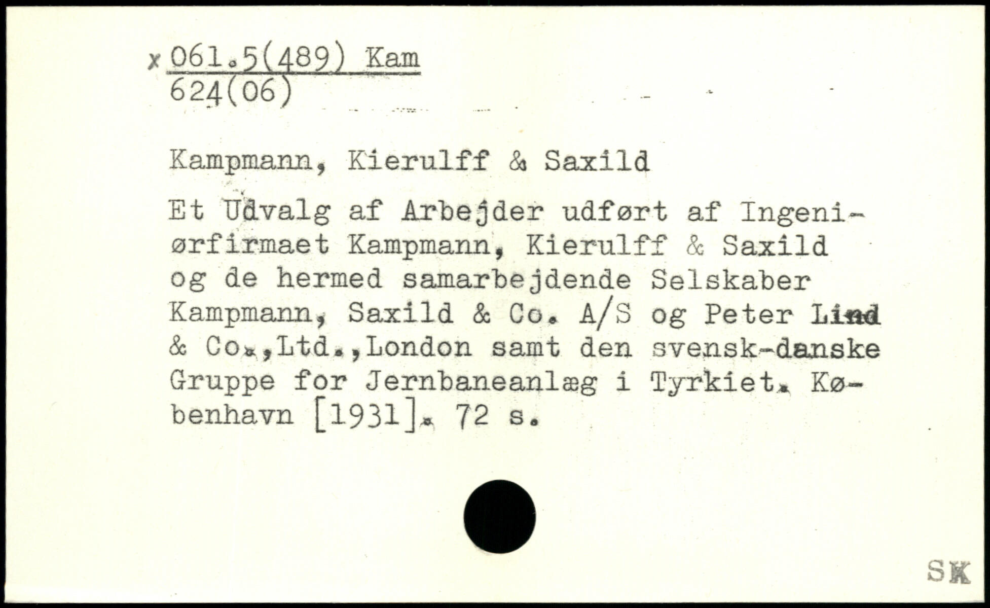 Kampmann, Kierulff & Saxild Et Udvalg af Arbejder udført af Ingeniørfirmaet Kampmann, Kierulff & Saxild og de hermed samarbejdende Selskaber Kampmann, Saxild & Go, A/s og Peter Li,d & Co.,Ltd.,London samt den svensk-danske Gruppe for Jernbaneanlæg i Tyrkiet.