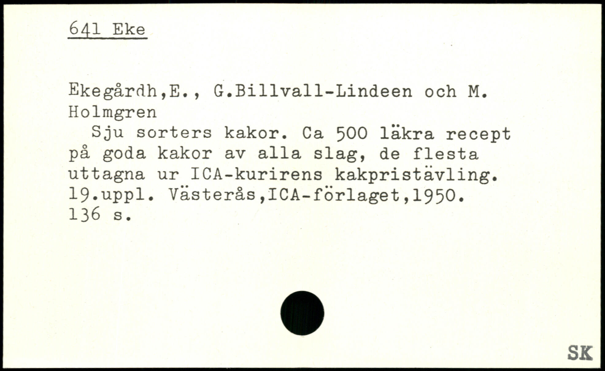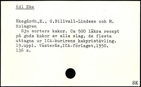 Ekegårdh,E., G.Billvall-Lindeen och M. Holmgren Sju sorters kakor. Ca 500 läkra recept på goda kakor av alla slag, de flesta uttagna ur ICA-kurirens kakpristävling.