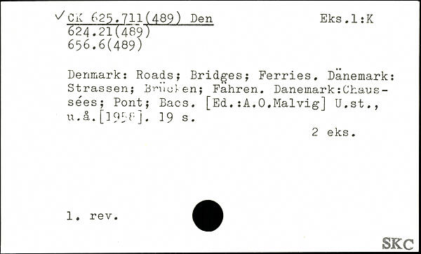 Denmark: Roads; Bridges; Ferries. Dänemark: Strassen; Snic/en; Fahren. Dänemark:Chans -sees; Pont; Bacs. [Ed.:A.0.Malvig] U.st., u.a.[]958].