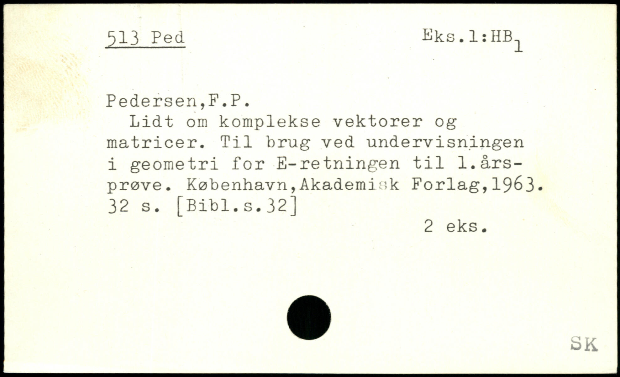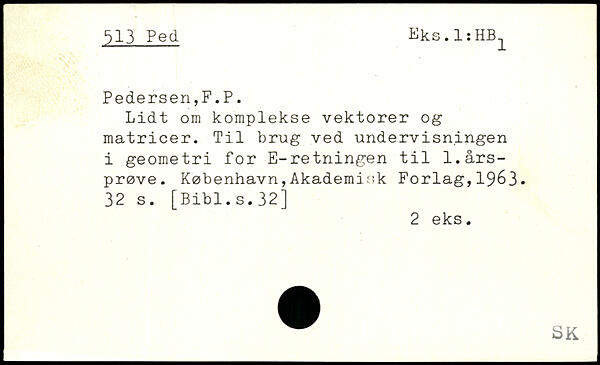 Lidt om komplekse vektorer og matricer. Til brug ved undervisningen i geometri for E-retningen til 1.årsprøve. København,Akademis,k Forlag, 1963.