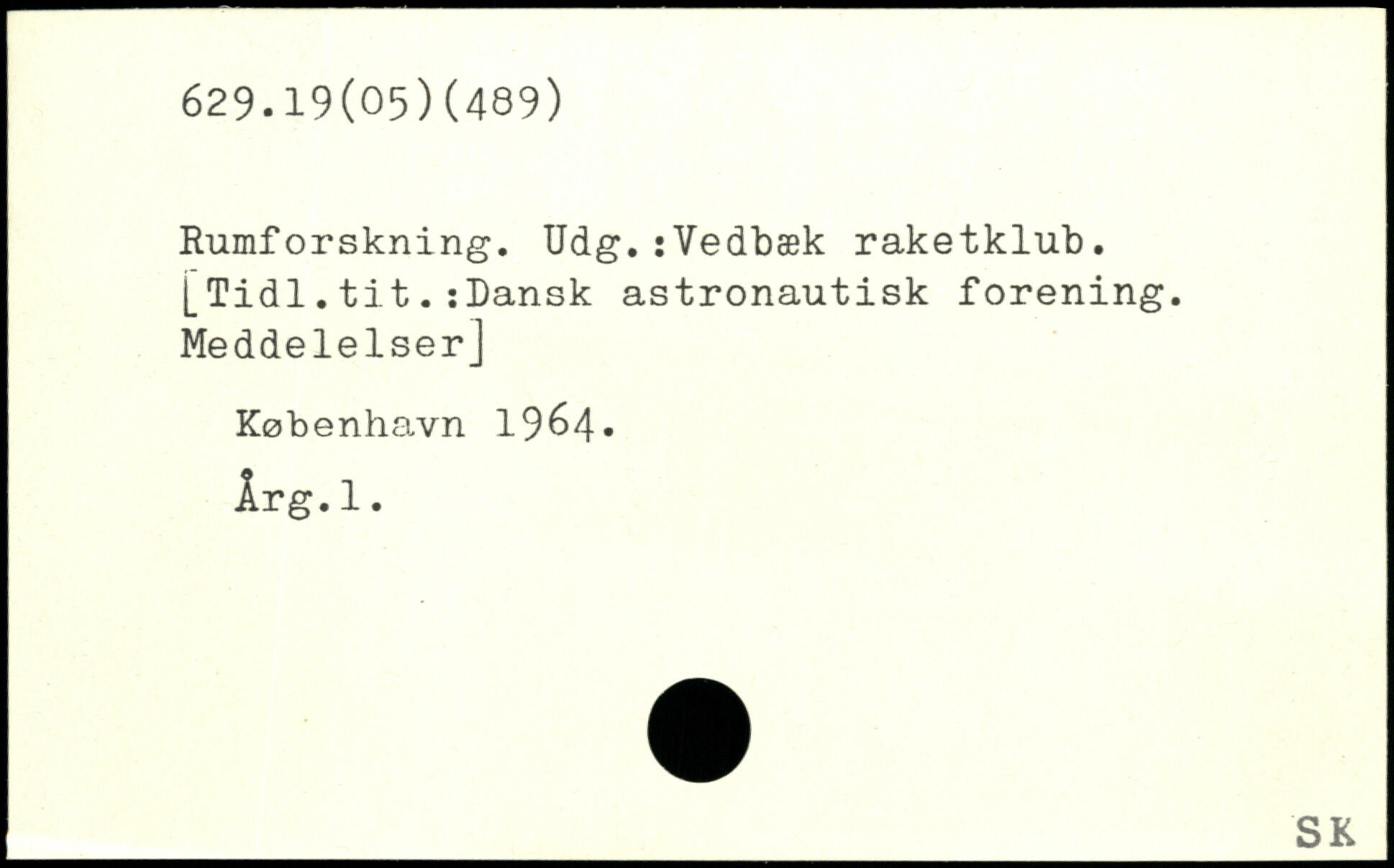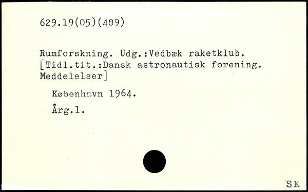 Rumforskning. Udg.i Vedbæk raketklub. [Tidl.tit.:Dansk astronautisk forening. Meddelelser] København 19&4- Arg.1.