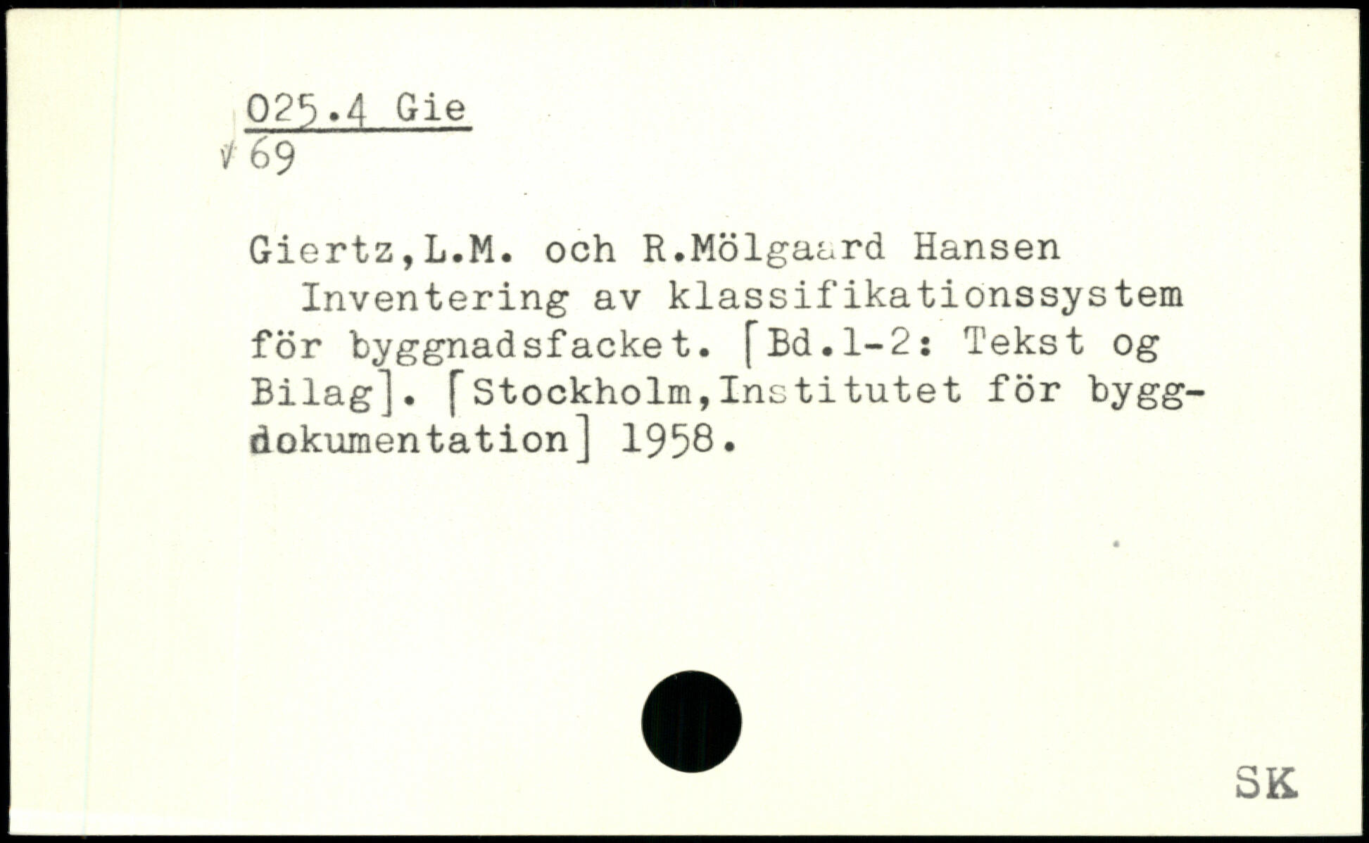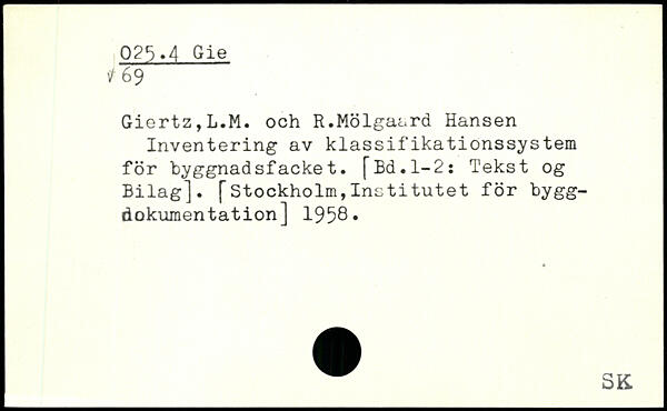Giertz,L.M. och R.Molgaard Hansen Inventering av klassifikationssys tein for byggnadsfacket. [Ed.1-2: Tekst og Bilag]. [Stockholm,Institutet for bygg-dokumentation] 1958