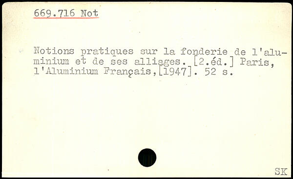 Notions pratiques sur la fonderie de l'aluminium et de ses alliages.^[2.éd.] Paris, l’Aluminium Français , [1947].