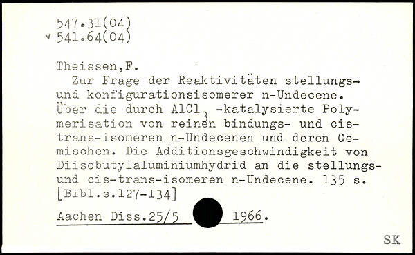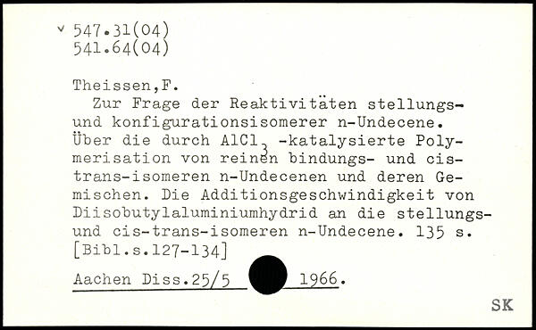 Zur Frage der Reaktivitäten stellungs-und konfigurationsisomerer n-Undecene. Über die durch A1C1 -katalysierte Polymerisation von reinen bindungs- und cis-trans-isomeren n-Undecenen und deren Gemischen. Die Additionsgeschwindigkeit von Diisobutylaluminiumhydrid an die stellungs-und cis-trans-isomeren n-Undecene.