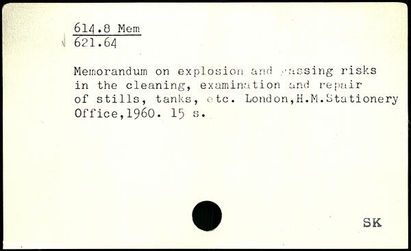 Memorandum on explosion and -assing risks in the cleaning, examination and repair of stills, tanks, etc. London,H.M.Stationery Office,1960.