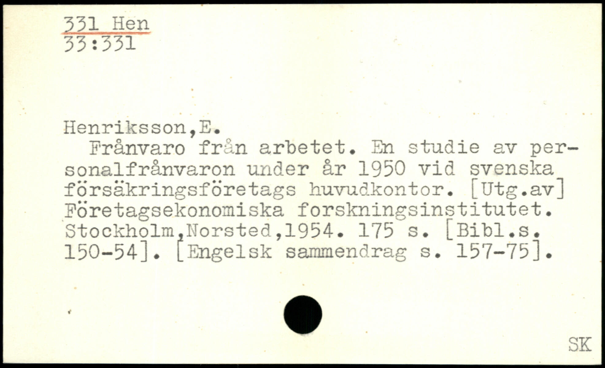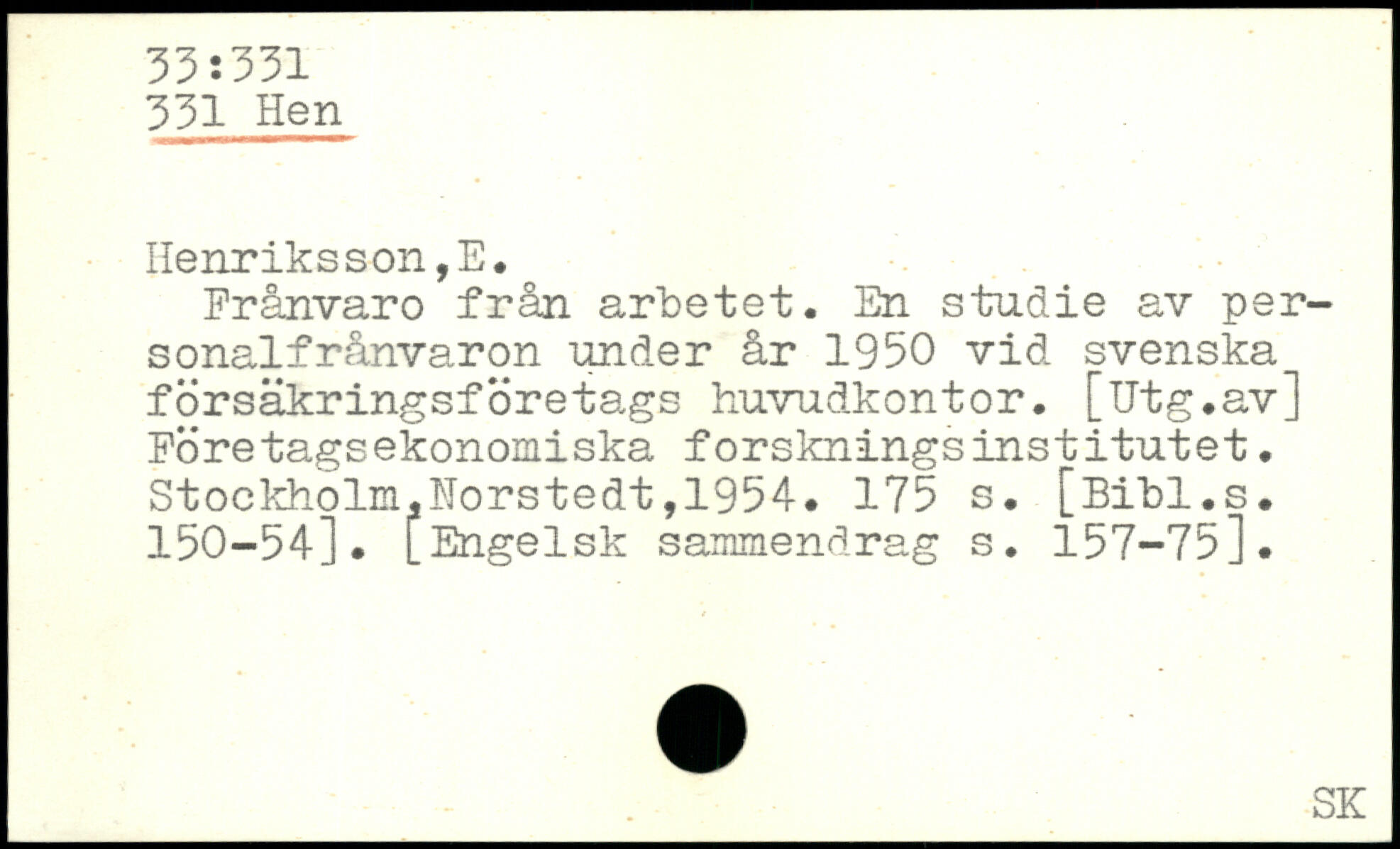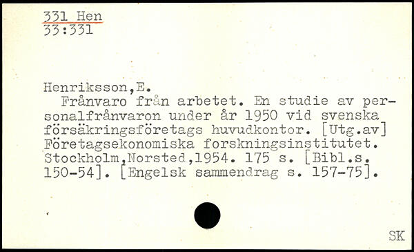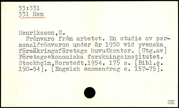Frånvaro från arbetet. En studie av personalfrånvaron under år 1950 vid svenska försäkringsföretags huvudkontor. [Utg.av] Företagsekonomiska forskningsinstitutet.