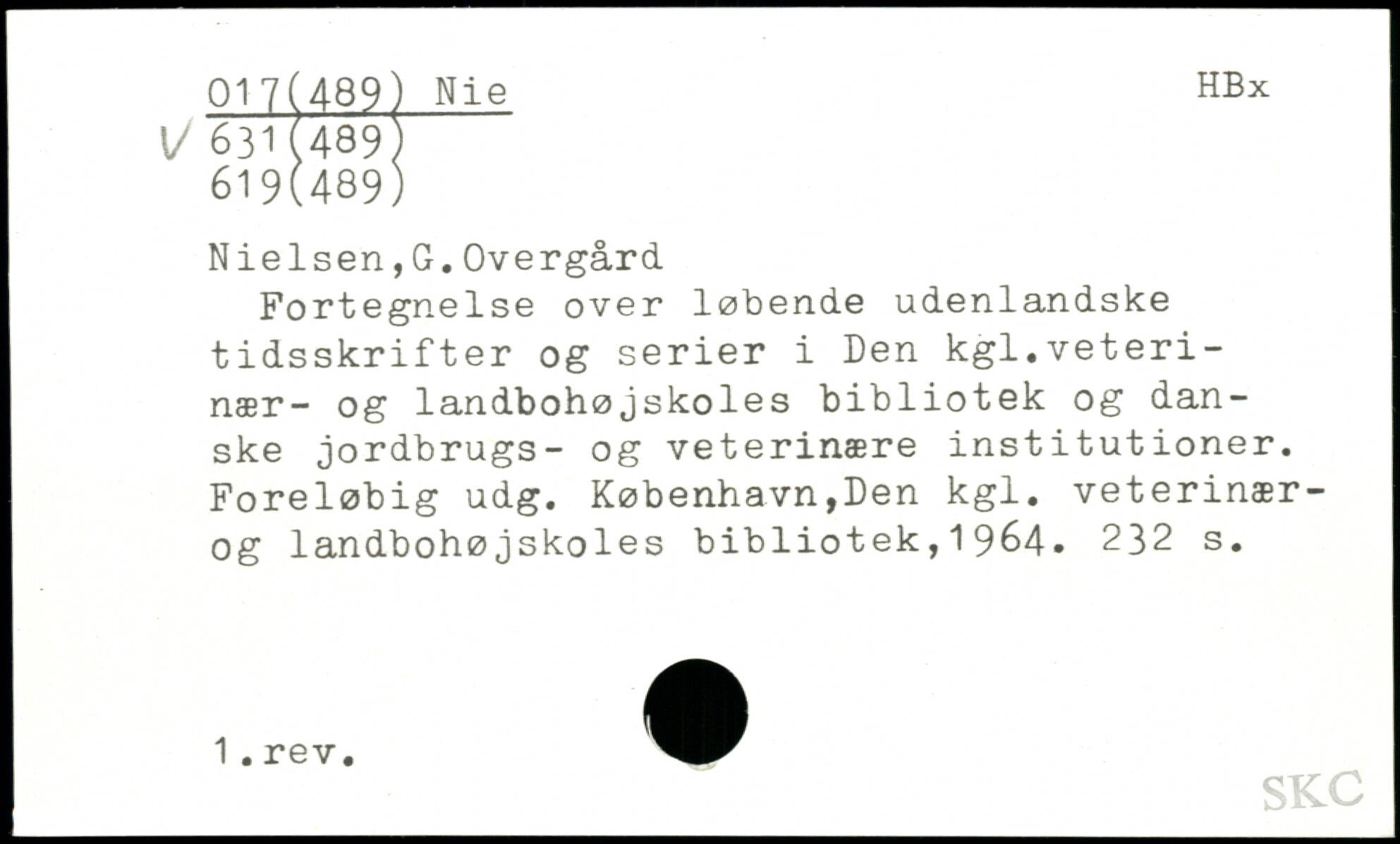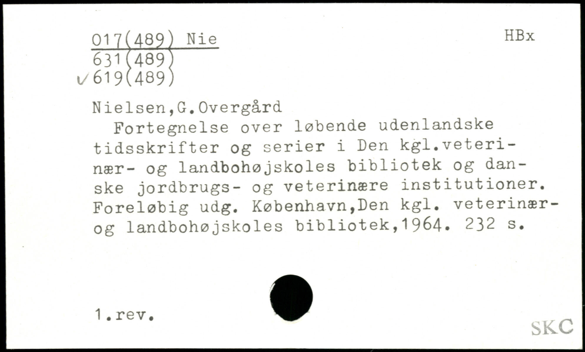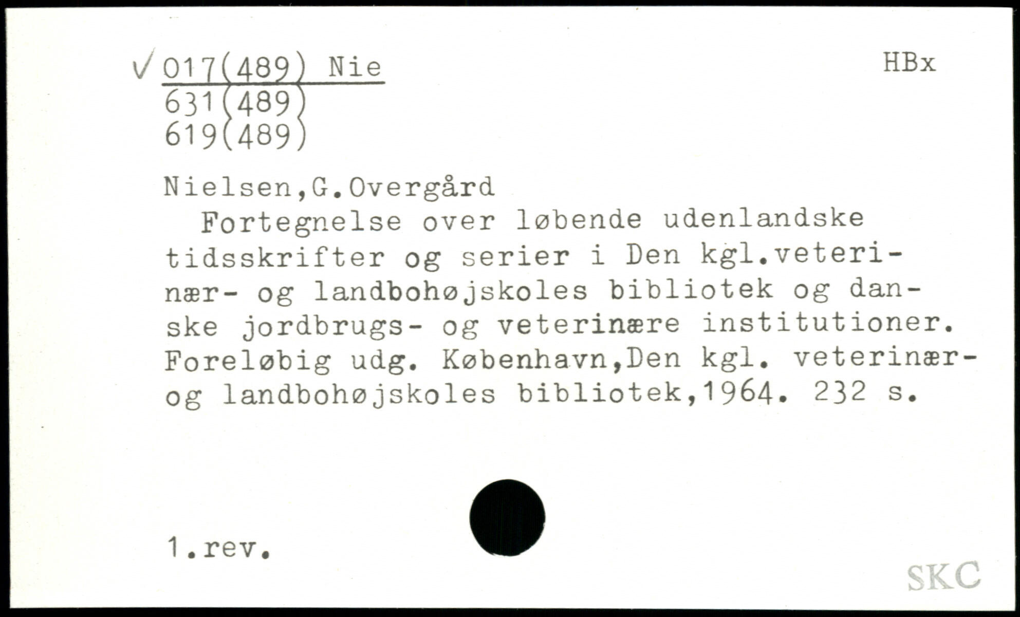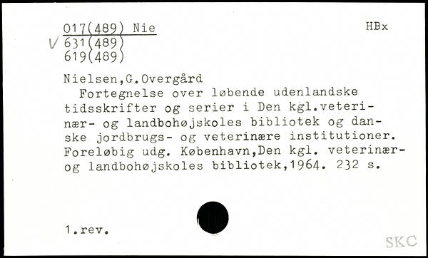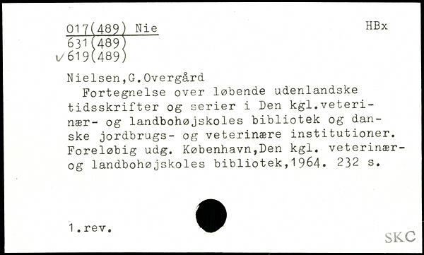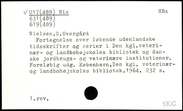 Nielsen,G.Overgård Fortegnelse over løbende udenlandske tidsskrifter og serier i Den kgl.veterinær- og landbohøjskoles bibliotek og danske jordbrugs- og veterinære institutioner. Foreløbig udg. København,Den kgl. veterinær-og landbohøjskoles bibliotek,1964.
