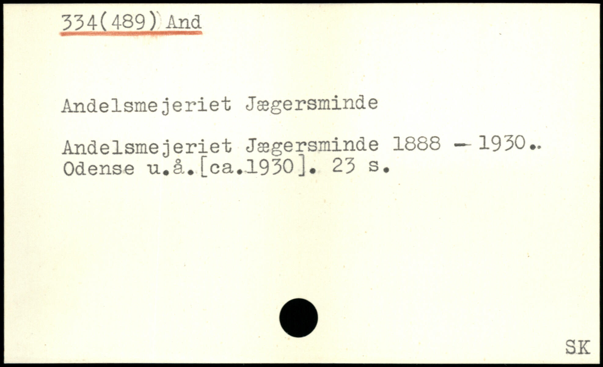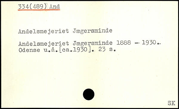 Andelsmejeriet Jægersminde Andelsmejeriet Jægersminde 1888 — 1930.. Odense u.å.[ca.1930].