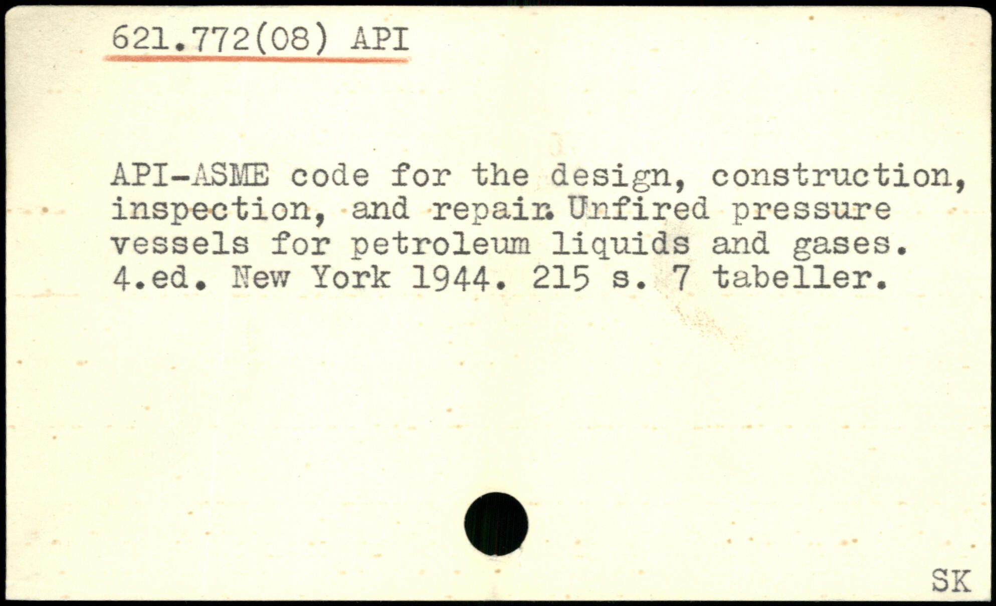 API-ASME code for the design, construction, inspection, and repair. Unfired pressure vessels for petroleum liquids and gases.