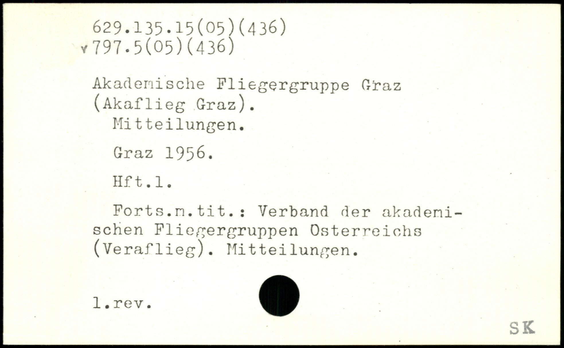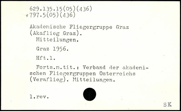 Akademische Fliegergruppe Graz (Akaflieg Graz). Mitteilungen. Graz 1956. Hft.l. Forts.n.tit.: Verband der akademischen Fliegergruppen Österreichs (Veraflieg). Mitteilungen.