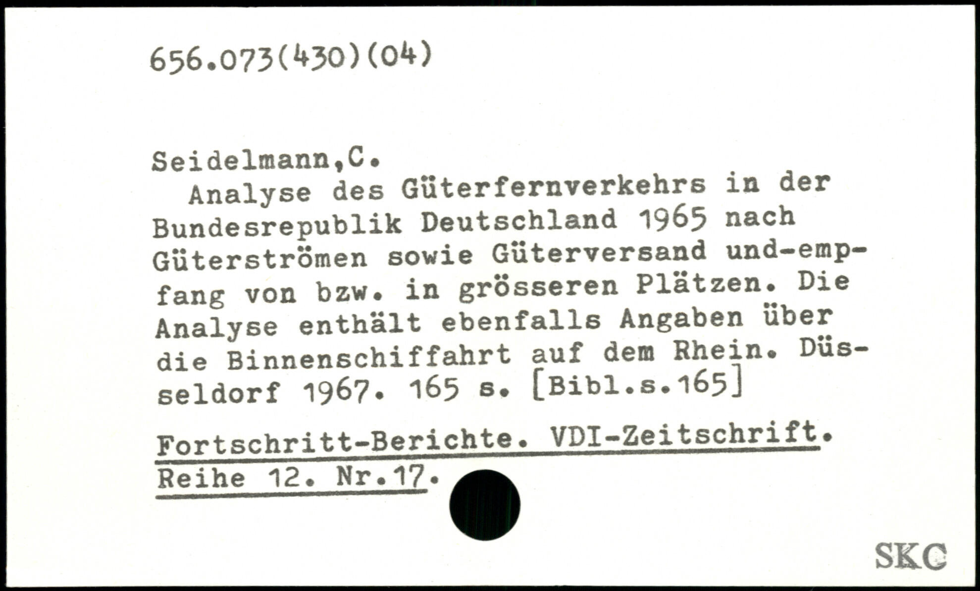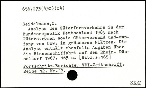 Analyse des Güterfernverkehrs in der Bundesrepublik Deutschland 1965 nach Güterströmen sowie Güterversand und-emp-fang von bzw. in grösseren Plätzen. Die Analyse enthält ebenfalls Angaben über die Binnenschiffahrt auf dem Rhein. Düsseldorf 1967.