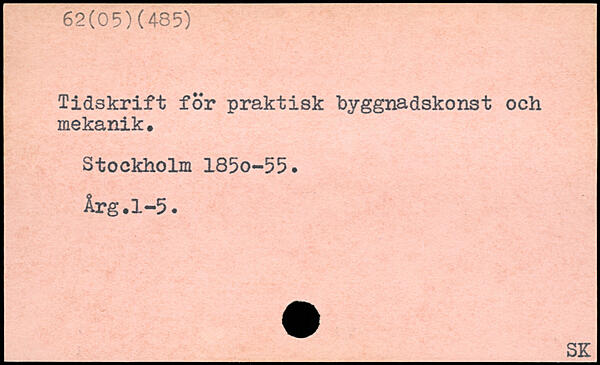 Tidskrift för praktisk byggnadskonst och mekanik. Stockholm 185o-55. Årg.1-5.
