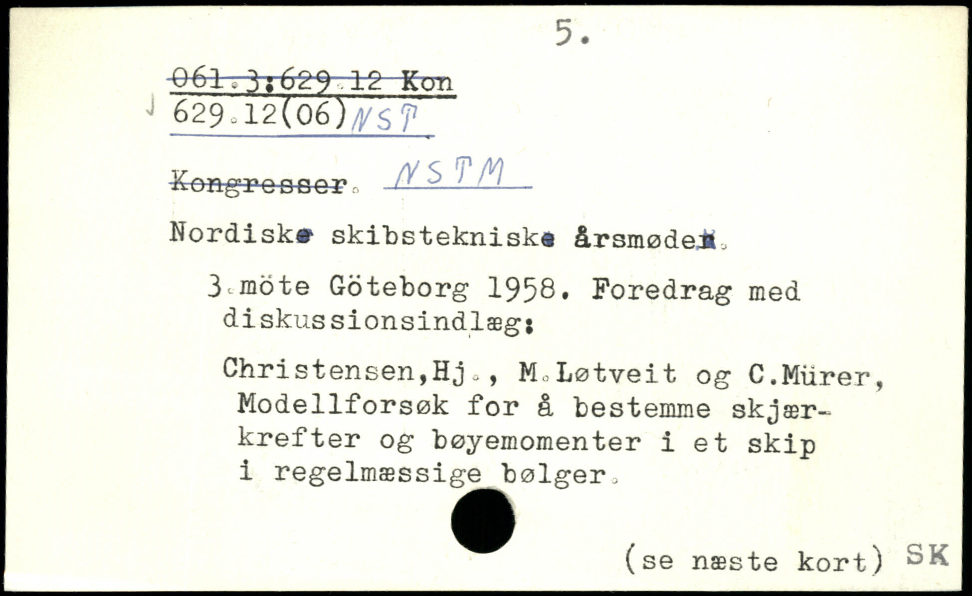 629~WoeJJsY^~ Kongrcpocr /VS ?M Nordisk# skibsteknisk, årsmødeil, 3 mote Goteborg 1958. Foredrag med diskussionsindlæg; Christensen,Hj,, M.Løtveit og C.Murer, Modellforsøk for å bestemme skjær-krefter og bøyemomenter i et skip i regelmæssige bølger,