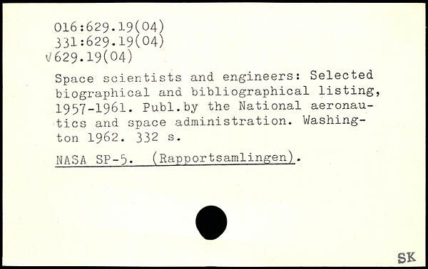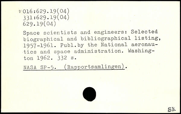 Space scientists and engineers: Selected biographical and bibliographical listing, ]_957_1961.