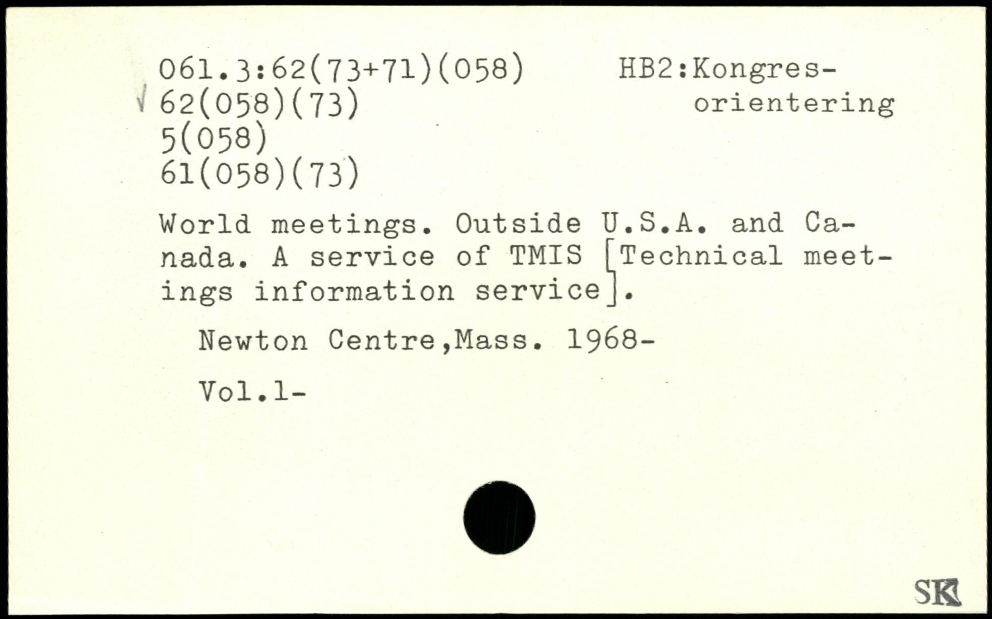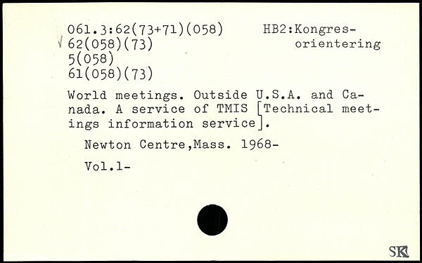 World meetings. Outside U.S.A. and Canada. A service of TMIS [Technical meetings information service]. Newton Centre,Mass. 1968- Vol.l-