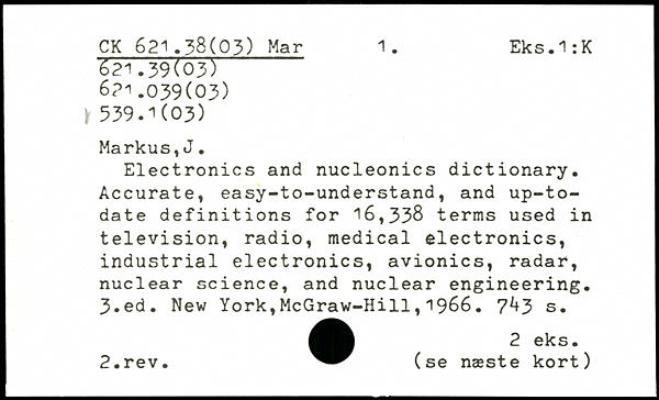 Electronics and nucleonics dictionary. Accurate, easy-to-understand, and up-to-date definitions for 16,33$ terms used in television, radio, medical electronics, industrial electronics, avionics, radar, nuclear science, and nuclear engineering.
