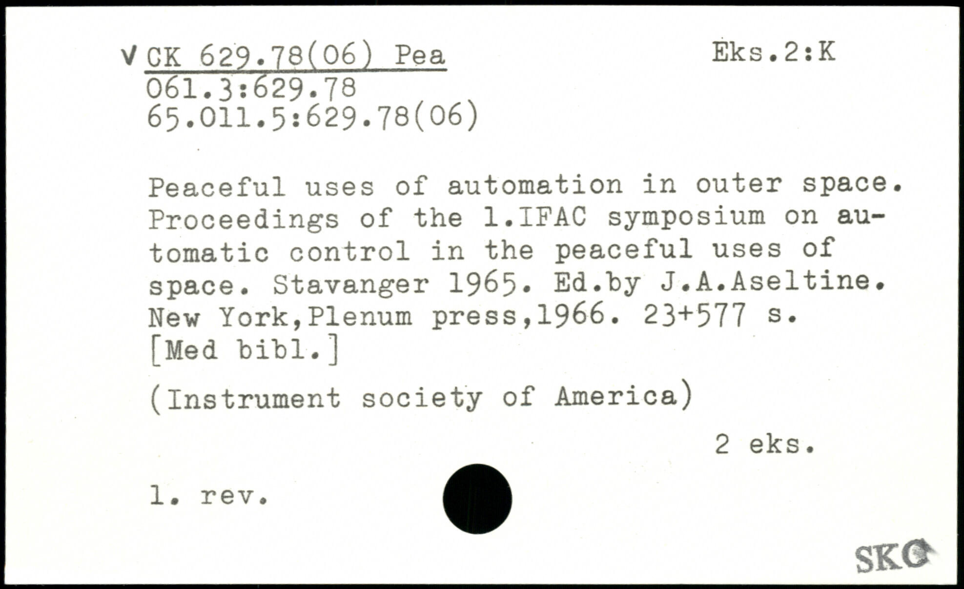 Peaceful uses of automation in outer space. Proceedings of the l.IFAC symposium on automatic control in the peaceful uses of space. Stavanger 1965. Ed.by J.A.Aseltine.