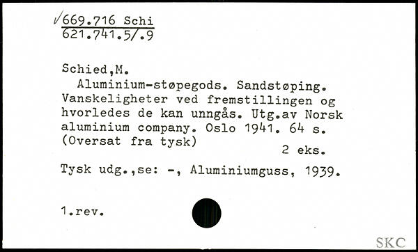 Aluminium-støpegods. Sandstøping. Vanskeligheter ved fremst1111ngen og hvorledes de kan unngås. Utg.av Norsk aluminium company. Oslo 19^+1. Gk s.