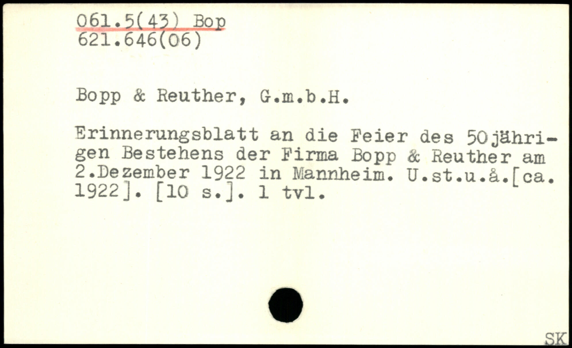 Bo pp & Reuther, Cr.m.b.H. Erinnerungsblatt an die Feier des 50jährigen Bestehens der Firma Bopp & Reuther am 2.Dezember 1922 in Mannheim, U.st.u.ä.rca. 1922], [