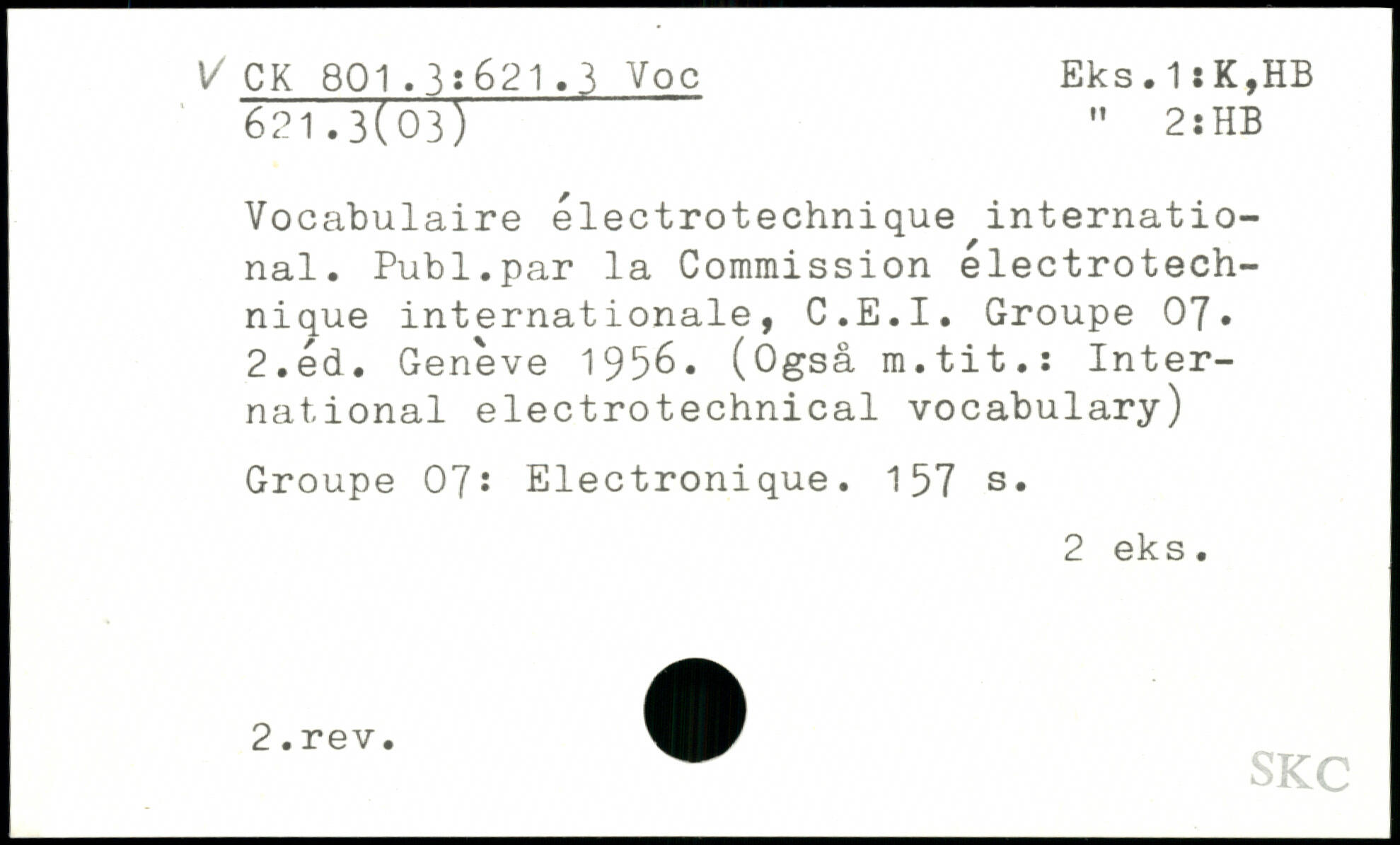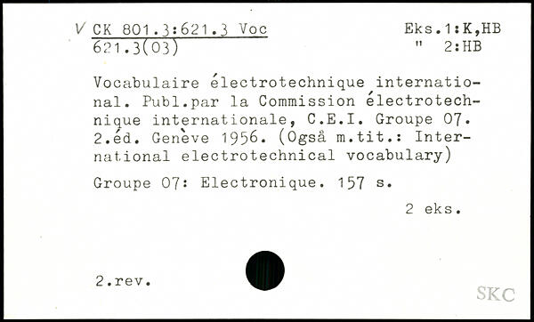 Vocabulaire électrotechnique international. Publ.par la Commission electrotech-nique internationale, C.E.I. Groupe 07, 2.éd. Genève 1956. (Ogsâ m.tit.: International electrotechnical vocabulary) Groupe 07: Electronique.
