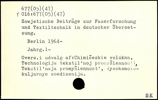 Sowjetische Beitrage zur Faserforschung und Textiltechnik in deutscher Übersetzung. Berlin 19&4-Jahrg.1- Overs.i udvalg af:Chimiceskie volokna, Technologija tekstil'noj promyslennosI L Tekstil'naja promyslennos t' , \/ysokomole-kuljarnye soedinenija.