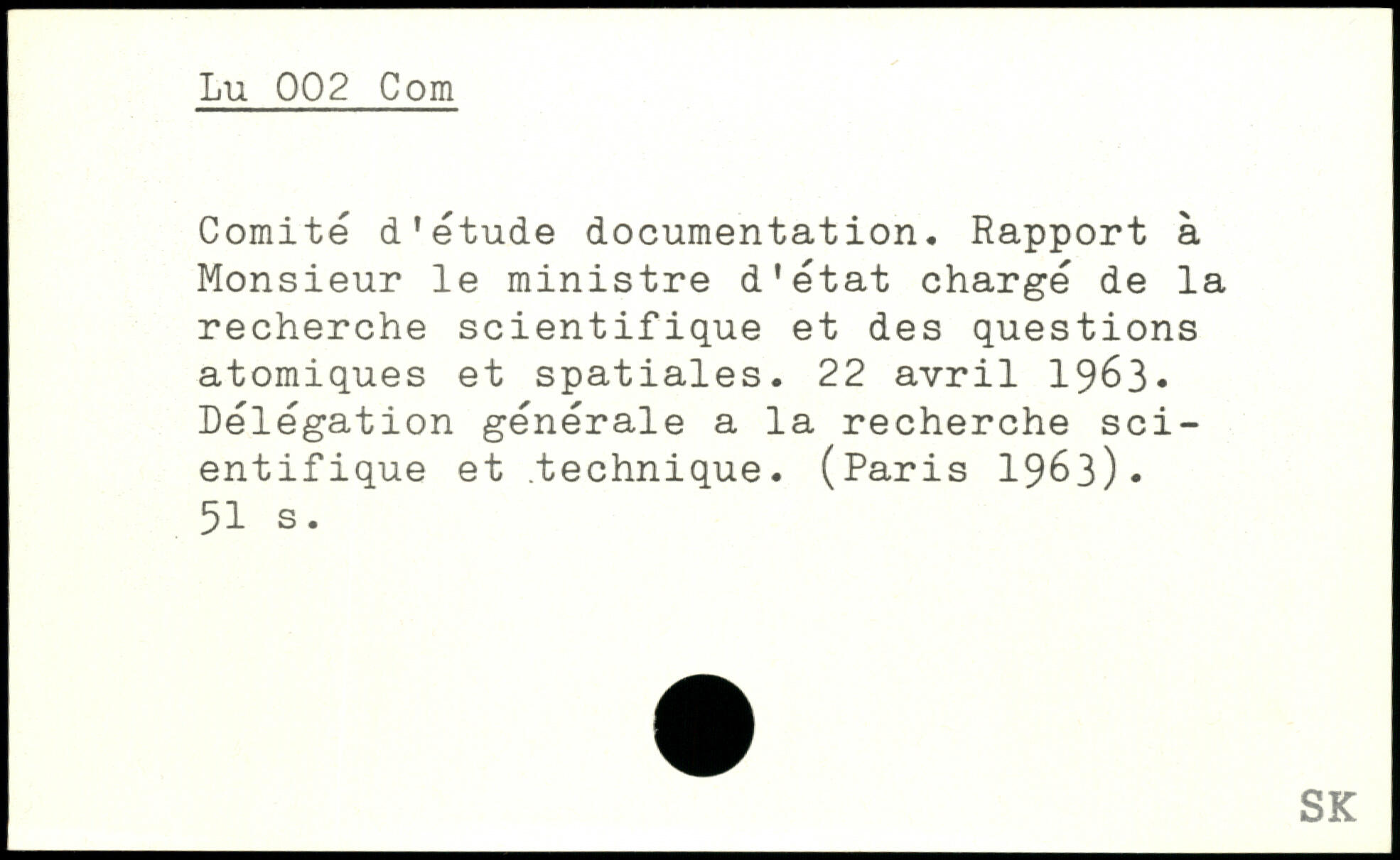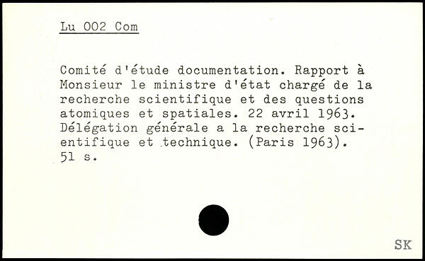 Comité d'étude documentation. Rapport à Monsieur le ministre d'état chargé de la recherche scientifique et des questions atomiques et spatiales. 22 avril 1963, Délégation générale a la recherche scientifique et .technique. (