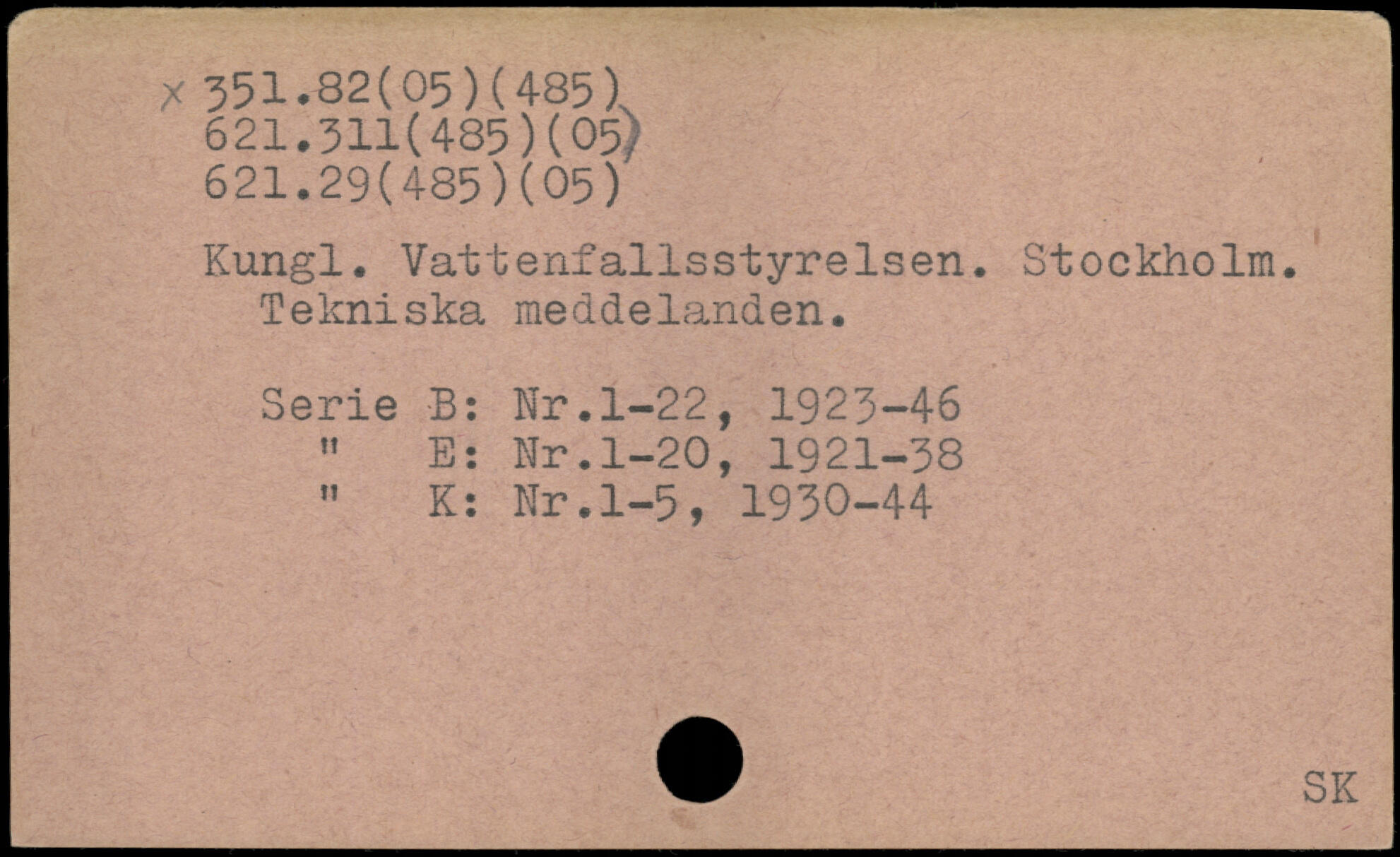Kungl. Vattenfallsstyrelsen. Stockholm. Tekniska meddelanden. Serie B: Kr.1-22, 1923-46 " E: Nr.1-20, 1921-38 n K: Nr.1-5, 1930-44 W SK