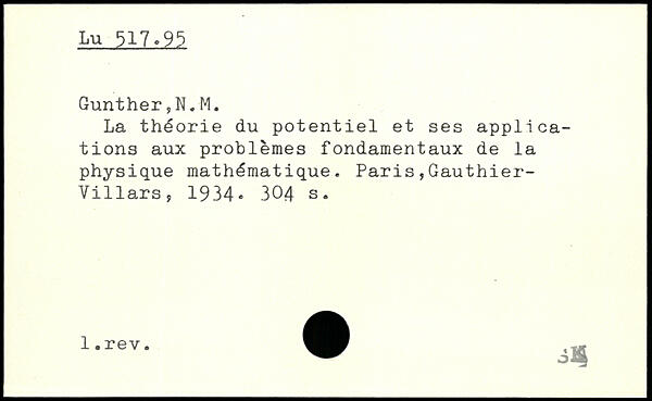 La théorie du potentiel et ses applications aux problèmes fondamentaux de la physique mathématique.