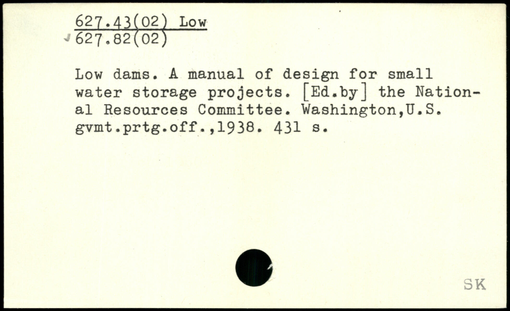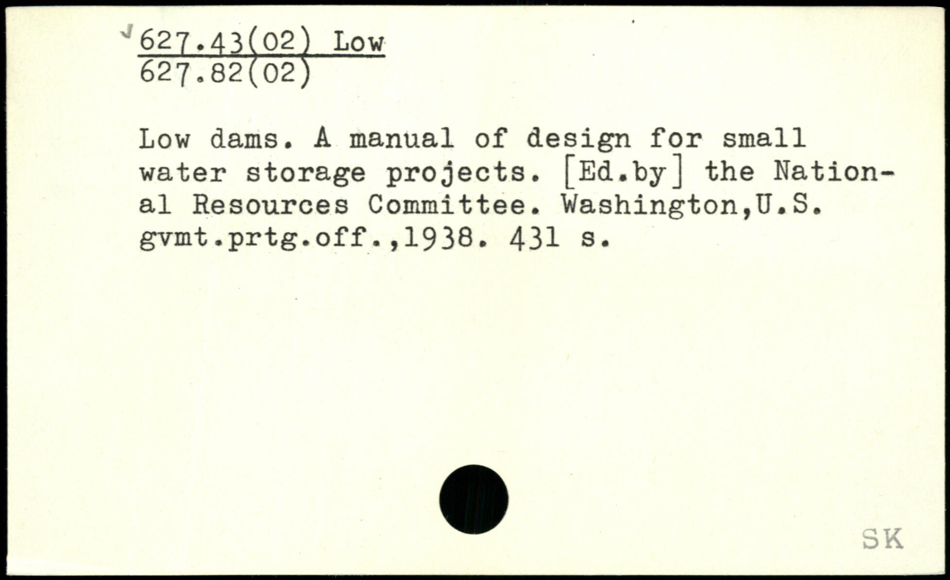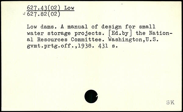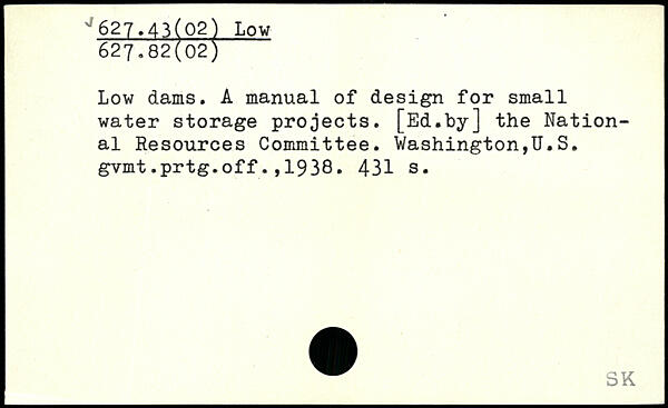 Low dams. A manual of design for small water storage projects. [Ed.by] the National Resources Committee. Washington,U.S. gvmt.prtg.off.,1938.