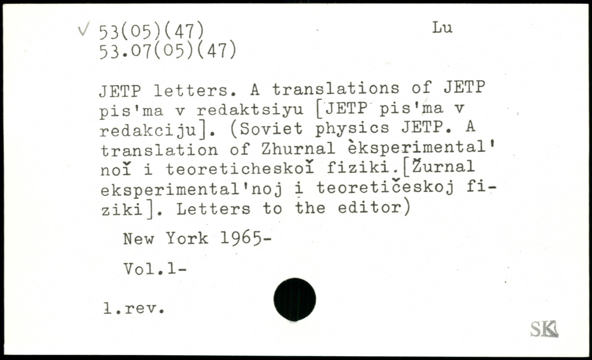 JETP letters. A translations of JETP pis'ma v redaktsiyu [JETP'pis'ma v redakciju]. (Soviet physics JETP. A translation of Zhurnal eksperimental. noi i teoreticheskoi fiziki.[Zurnal eksperimental’noj i teoreticeskoj fi-ziki]. Letters to the editor)
