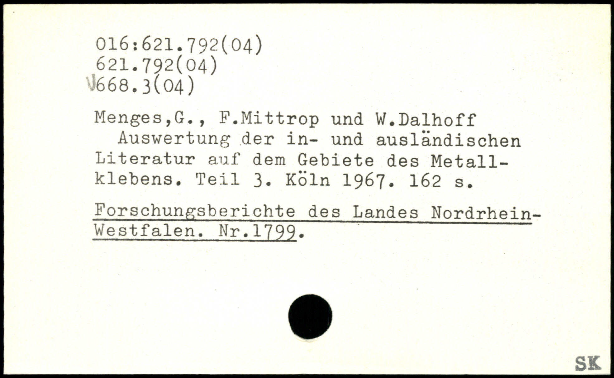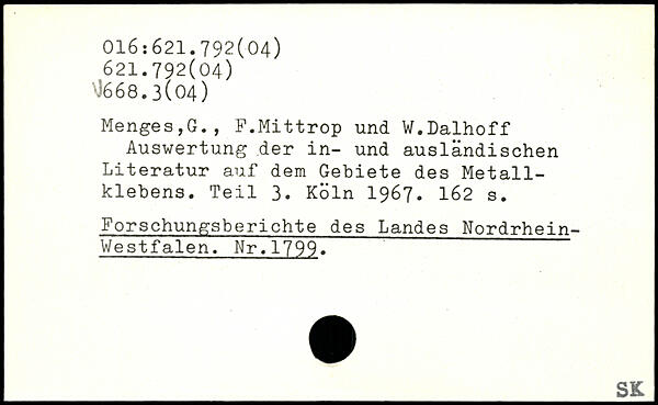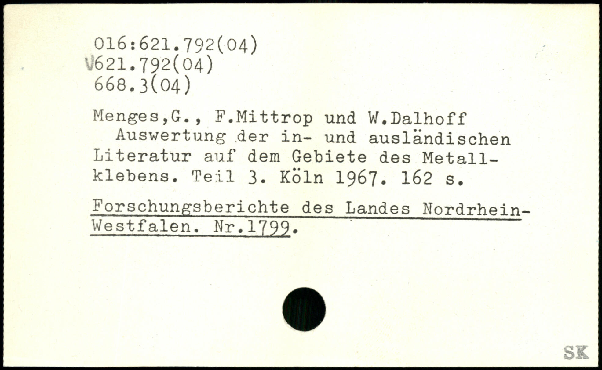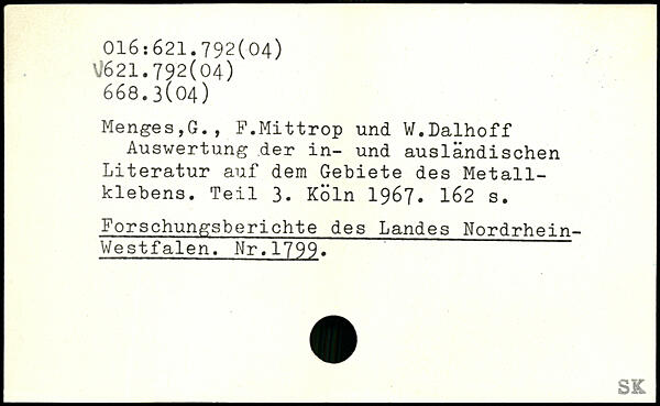 Menges,G., F.Mittrop und W.Dalhoff Auswertung der in- und ausländischen Literatur auf dem Gebiete des Metallklebens. Teil 3.