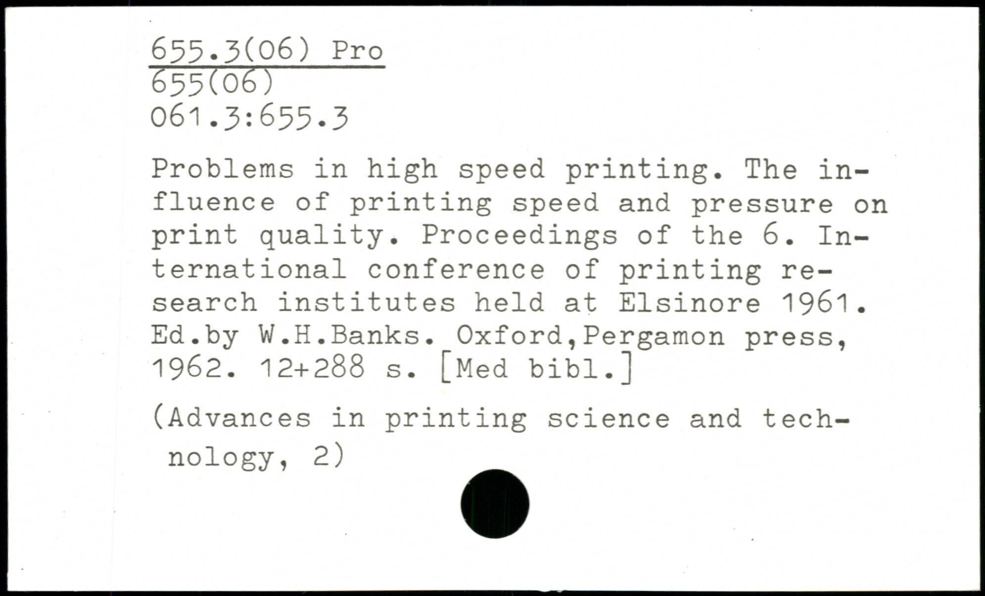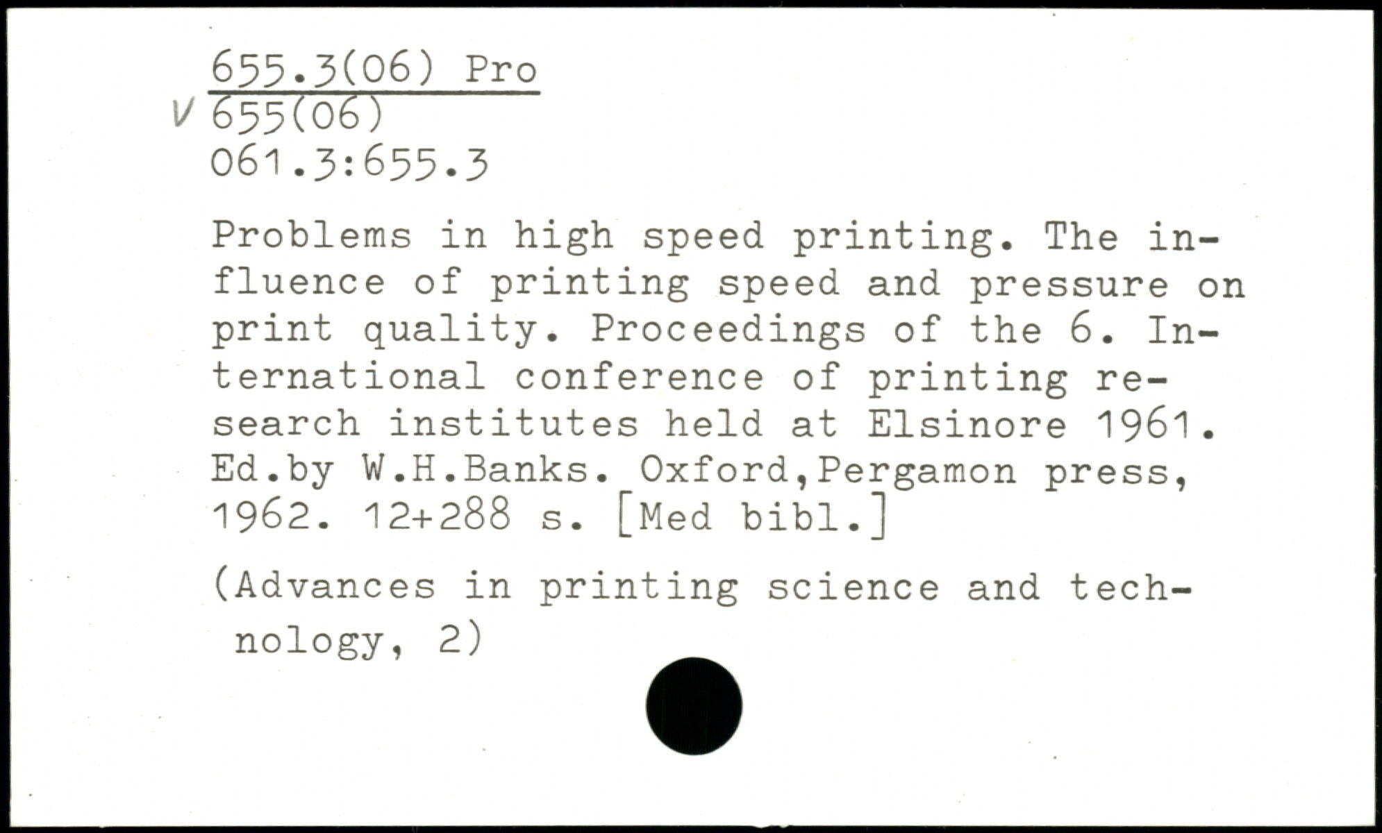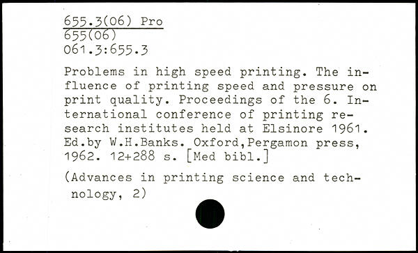 Problems in high speed printing. The influence of printing speed and pressure on print quality. Proceedings of the 6. International conference of printing research institutes held at Elsinore 1961. Ed.by W.H.Banks.