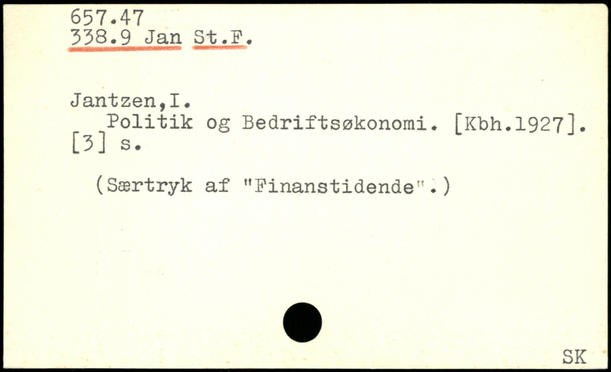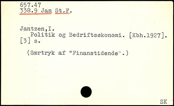 Politik og Bedriftsøkonomi. [Kbh.1927]. [3] s. (Særtryk af "Finanstidende".) _SK