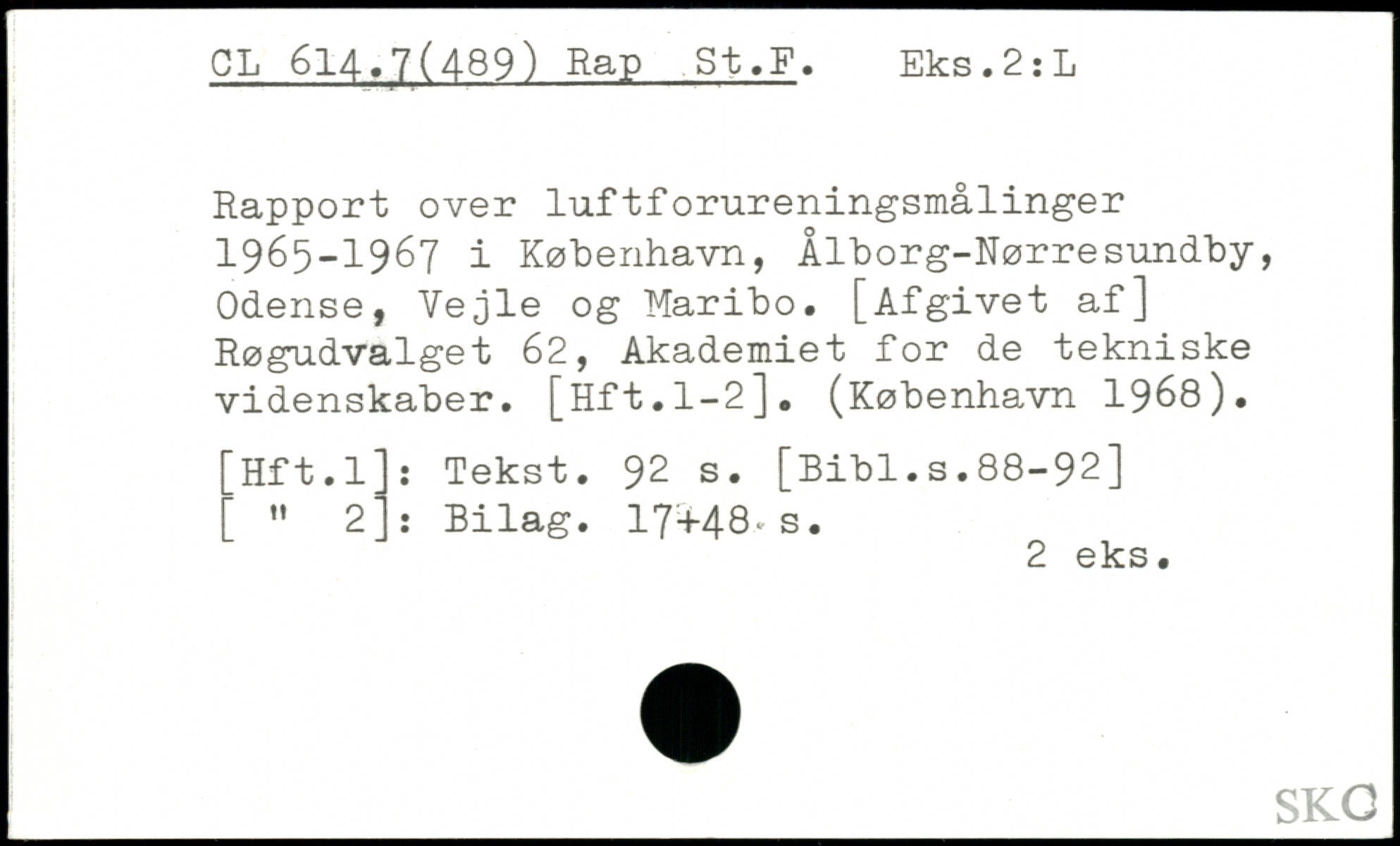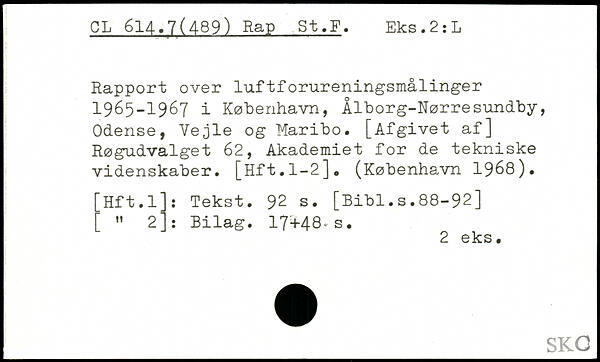 Rapport over luftforureningsmålinger 1965-1967 i København, Ålborg-Nørresundby, Odense, Vejle og Maribo. [Afgivet af] Røgudvalget 62, Akademiet for de tekniske videnskaber. [Hft.1-2], (