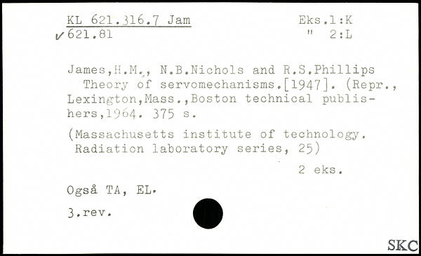 James,H.M., N,B.Nichols and R.S.Ph1111ps Theory of servomechanisms.[1947]. (