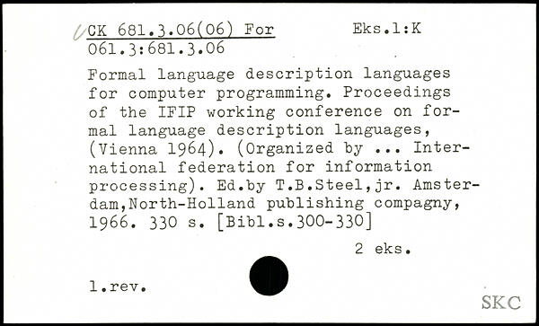 Formal language description languages for computer programming. Proceedings of the IFIP working conference on formal language description languages, (Vienna 1964). (Organized by ... International federation for information processing). Ed.by T.B.Steel,jr.