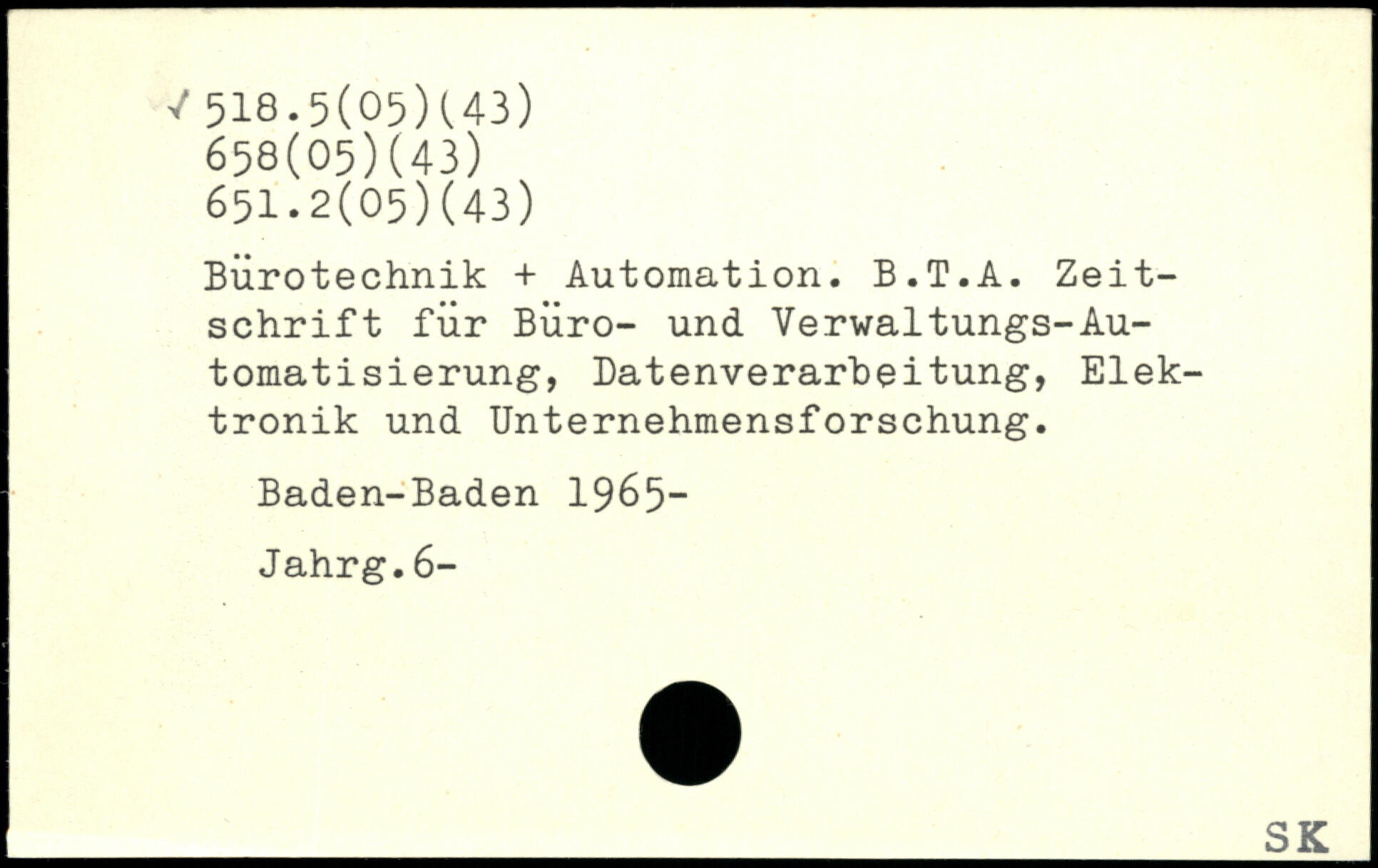 Bürotechnik + Automation. B.T.A. Zeitschrift für Büro- und Verwaltungs-Au-tomatisierung, Datenverarbeitung, Elektronik und Unternehmensforschung. Baden-Baden 1965- Jahrg.6-