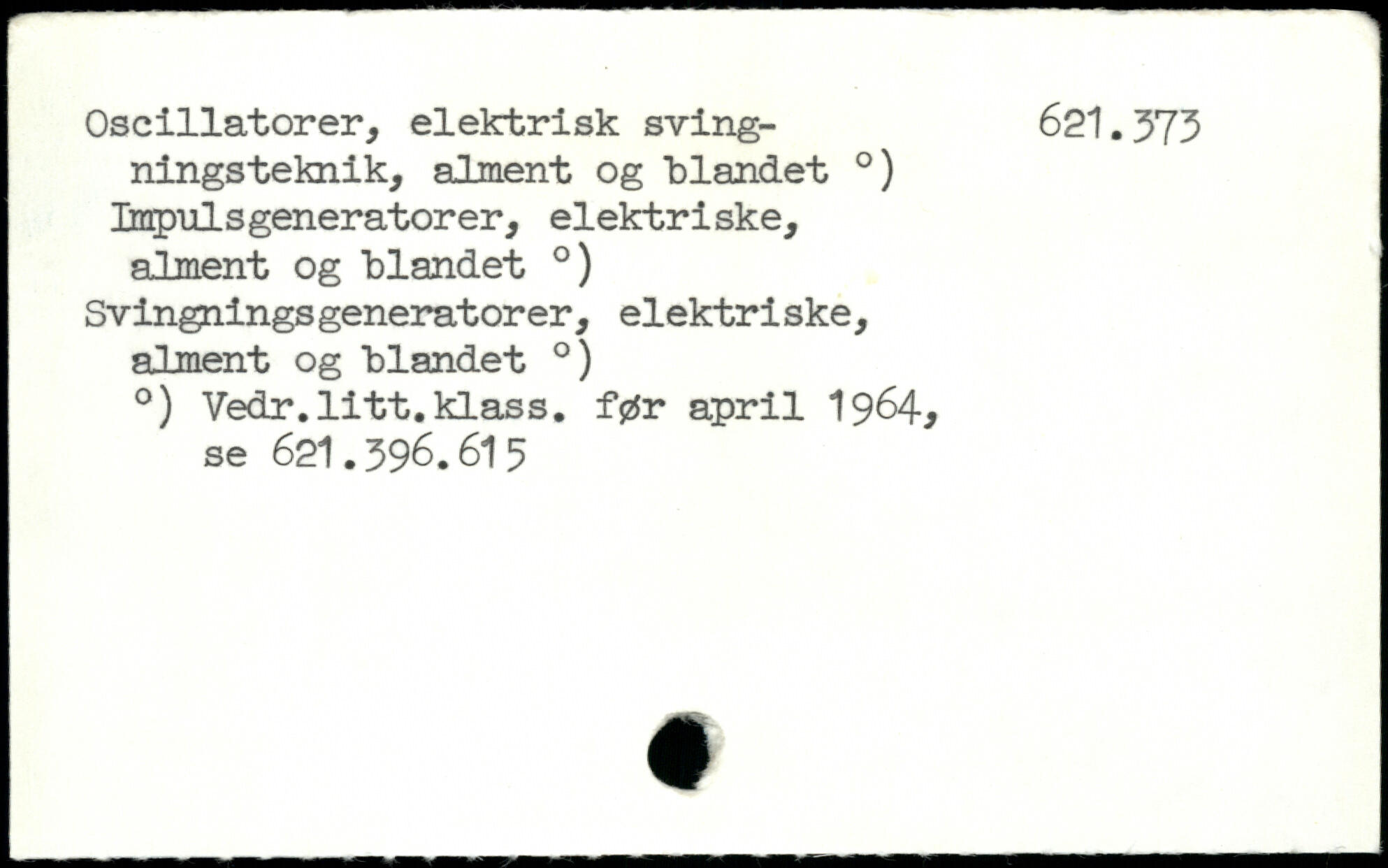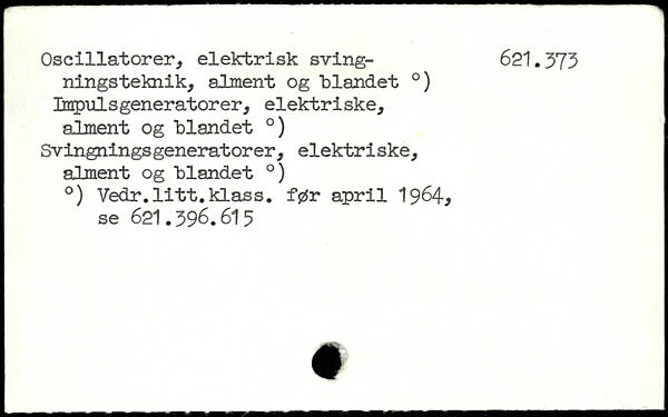 ningsteknik, alment og blandet .) Enpulsgeneratorer, elektriske, alment og blandet .) Svingningsgeneratorer, elektriske, alment og blandet .) .) Vedr.litt.klass. før april 1964, se 621.596.615